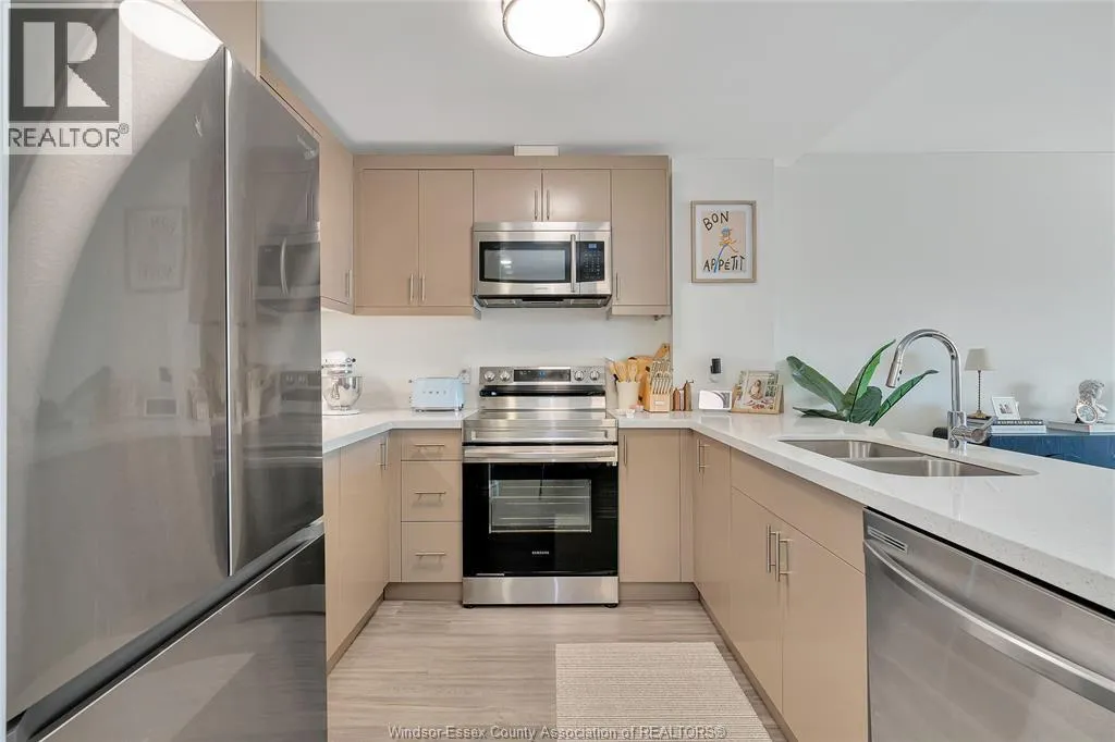 Fantastic East Side location in a newer building! Enjoy all of the amenities at Eastside Horizons while being close to shopping, walking trails, WFCU centre! This 2 bedroom, 2.5 bath unit features upgrades throughout, open concept great room, kitchen w/island, patio door leading to large balcony, plus in suite laundry! On-site party room, gym access and one designated parking spot.
