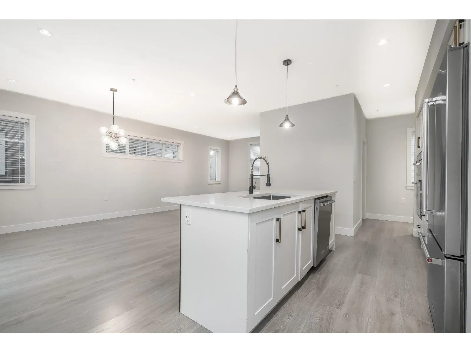 RARE 1,682 sf 2 bdrm/3bath END unit w rough in for ELEVATOR in Murrayville. Built by Zenterra, an award-winning builder known for quality & craftsmanship. This gently lived-in home offers modern comfort. An inviting open-concept main floor w/ a spacious kitchen, abundant cabinetry, updated lighting, a generous island-perfect for cooking & entertaining. The bright living room incl a cozy