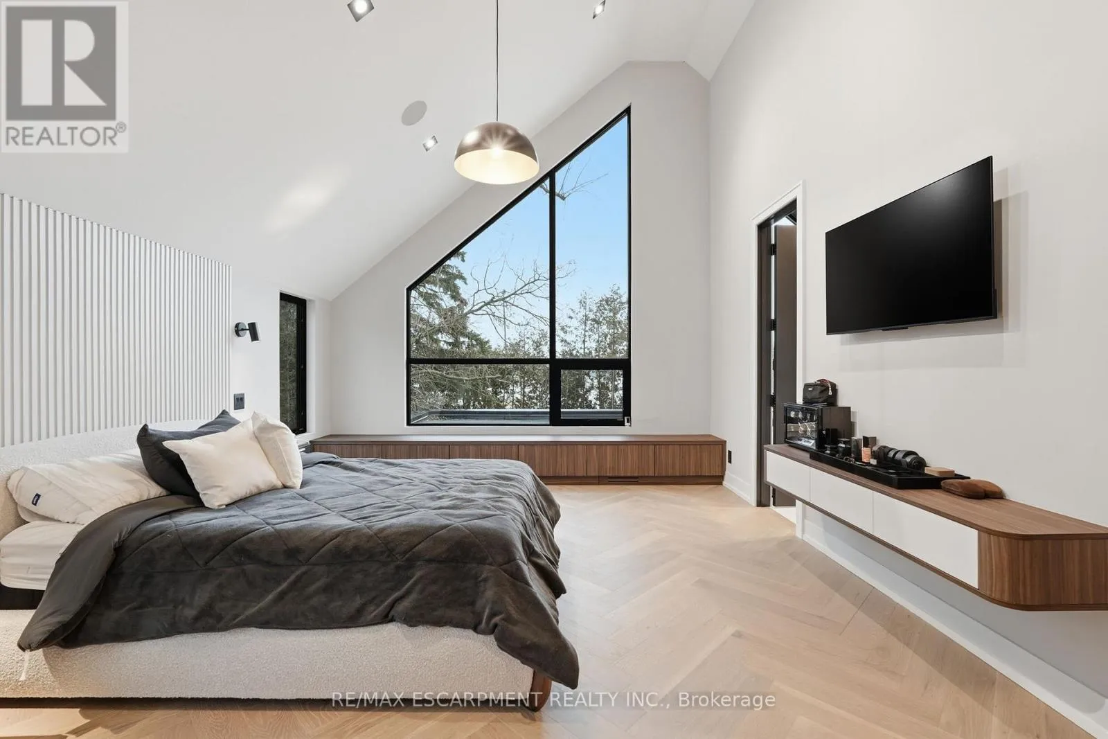 Step into this architecturally striking luxury residence, expertly crafted by Montbeck Developments, where exceptional design and meticulous craftsmanship span all three levels. This thoughtfully designed open-concept home showcases elegant herringbone-pattern white oak hardwood floors, soaring ceilings, and expansive floor-to-ceiling windows that bathe the interiors in natural light. The main level impresses with a sculptural glass-encased staircase and a designer kitchen