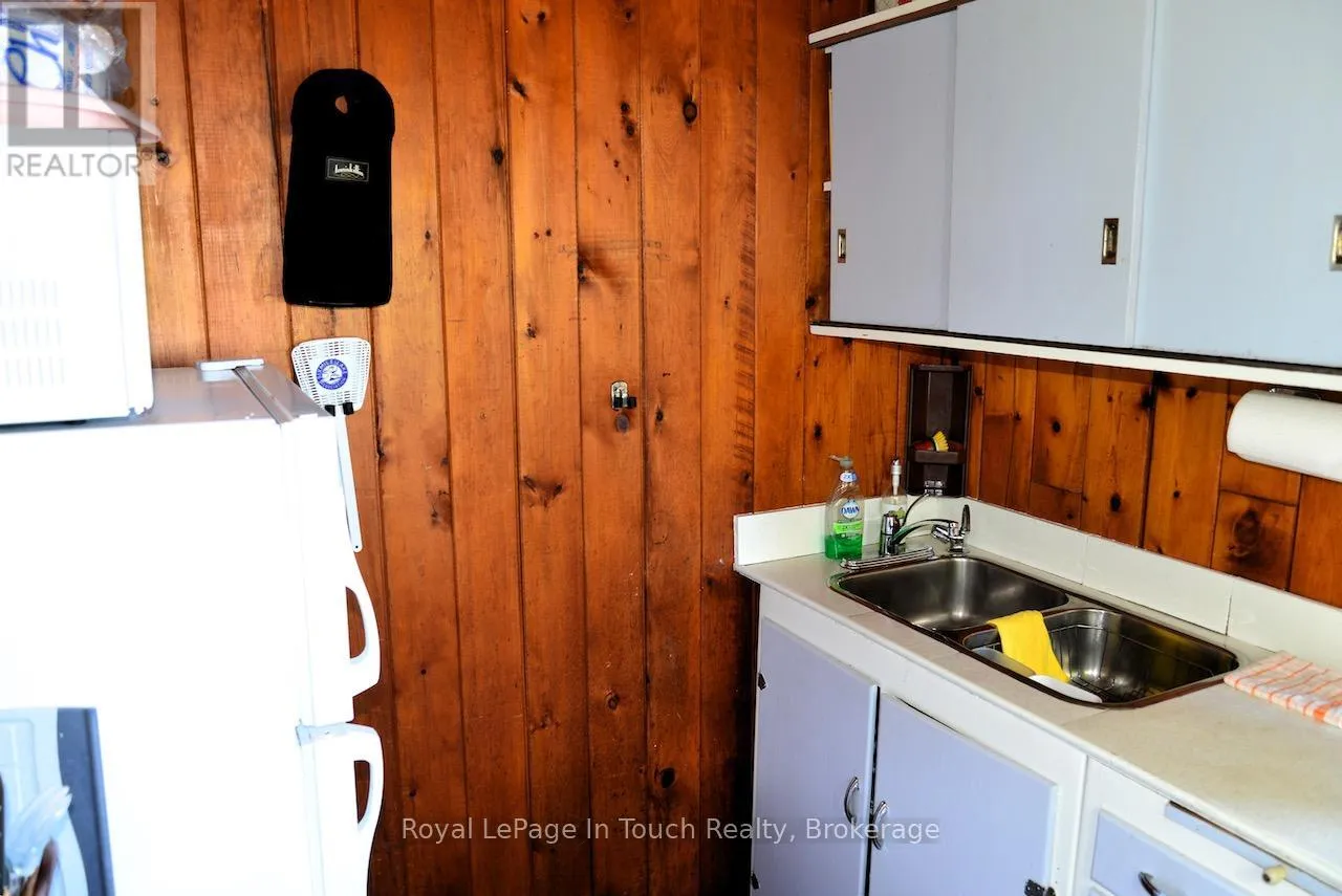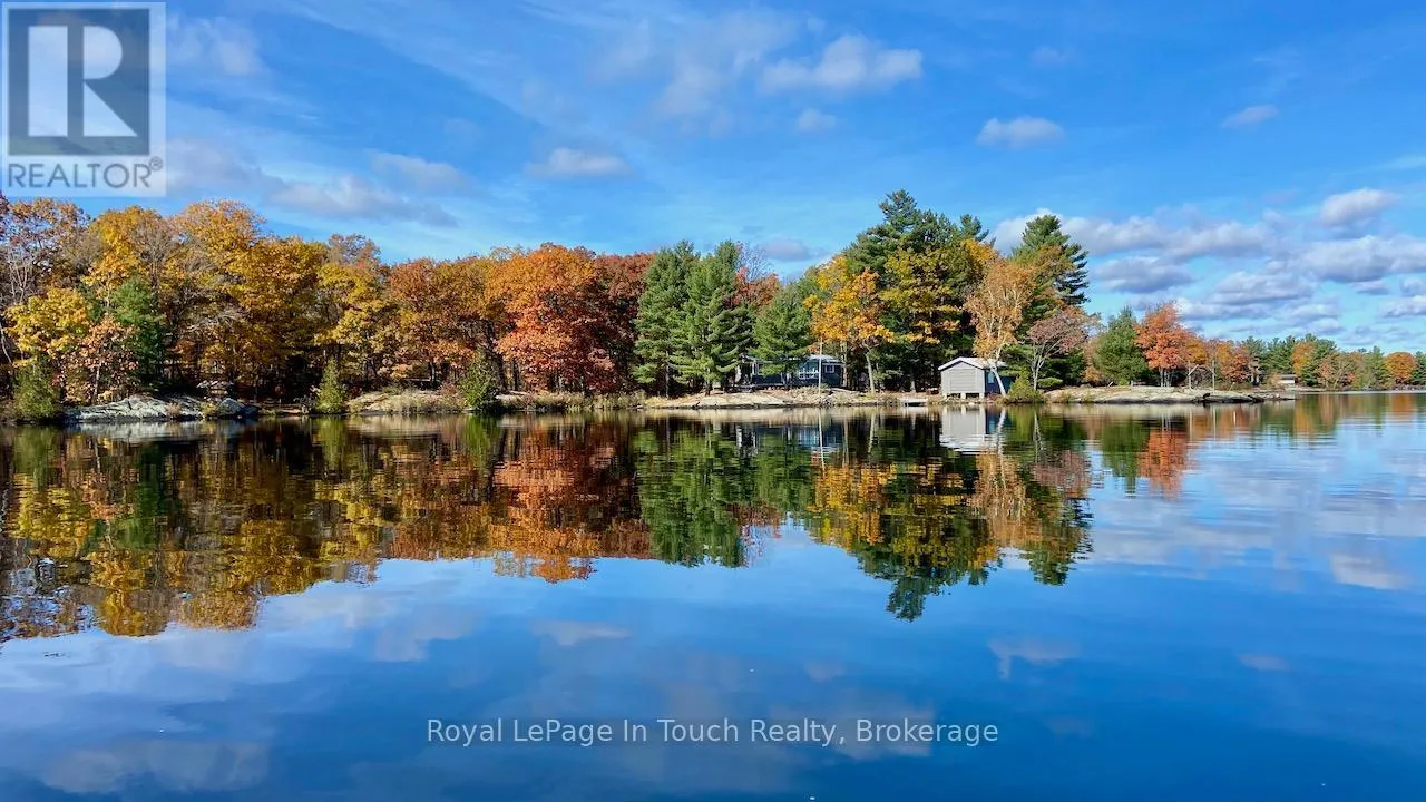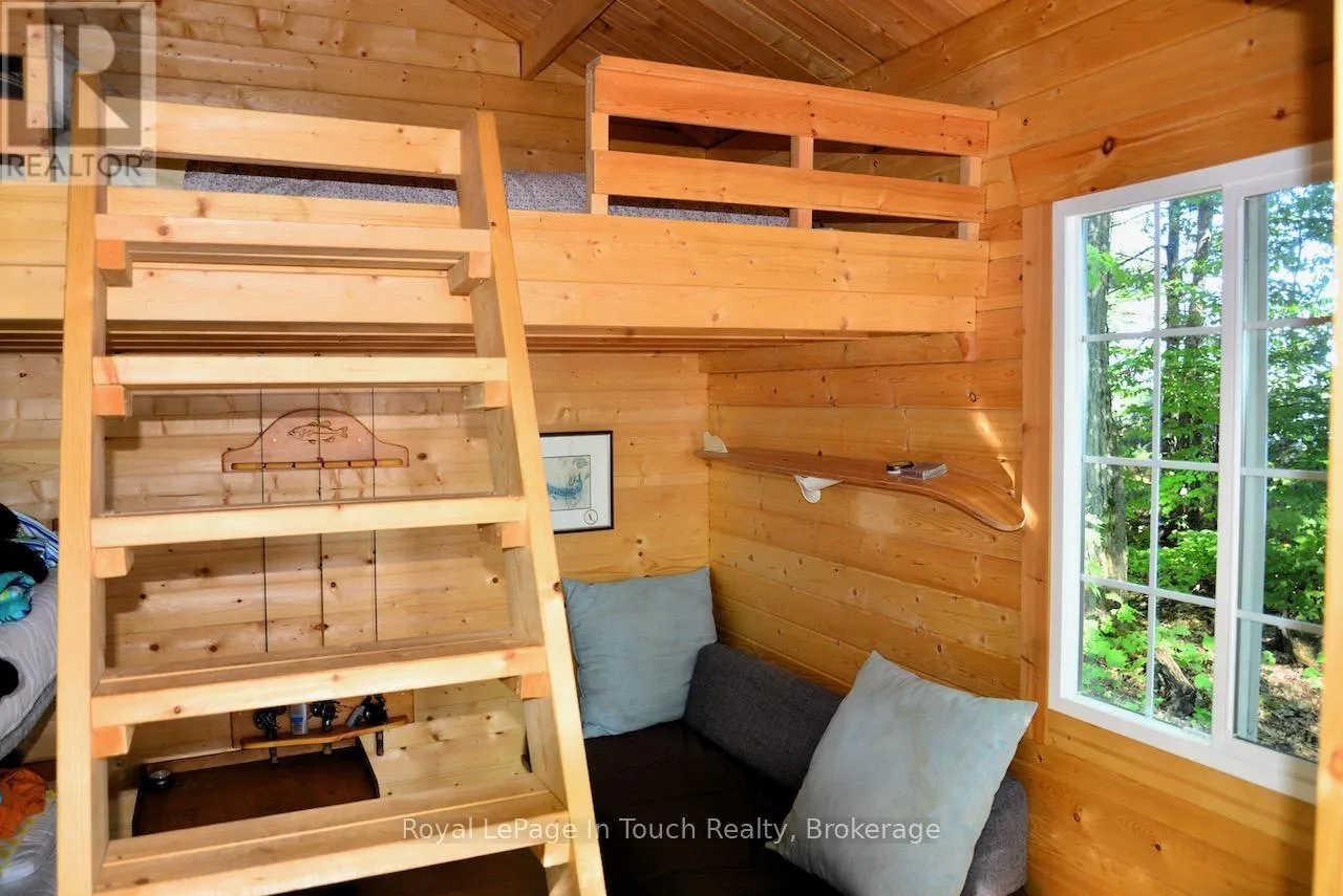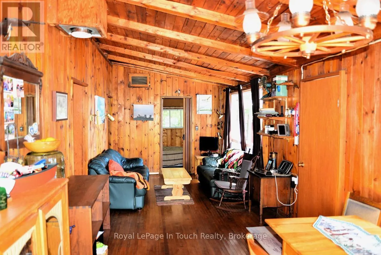 1916 Six Mile Lake Shore Cottage, This 1950’s Boat access (5-10min from Marinas) cottage has a huge, private (approximately 4.76 Acre) lot with over 800′ of shoreline. There are 3 buildings on it – the main Cottage, Dry Boat house and a Sleeping Bunkie all with no maintenance metal roofs. This large lot consists of mostly hardwood Oak &