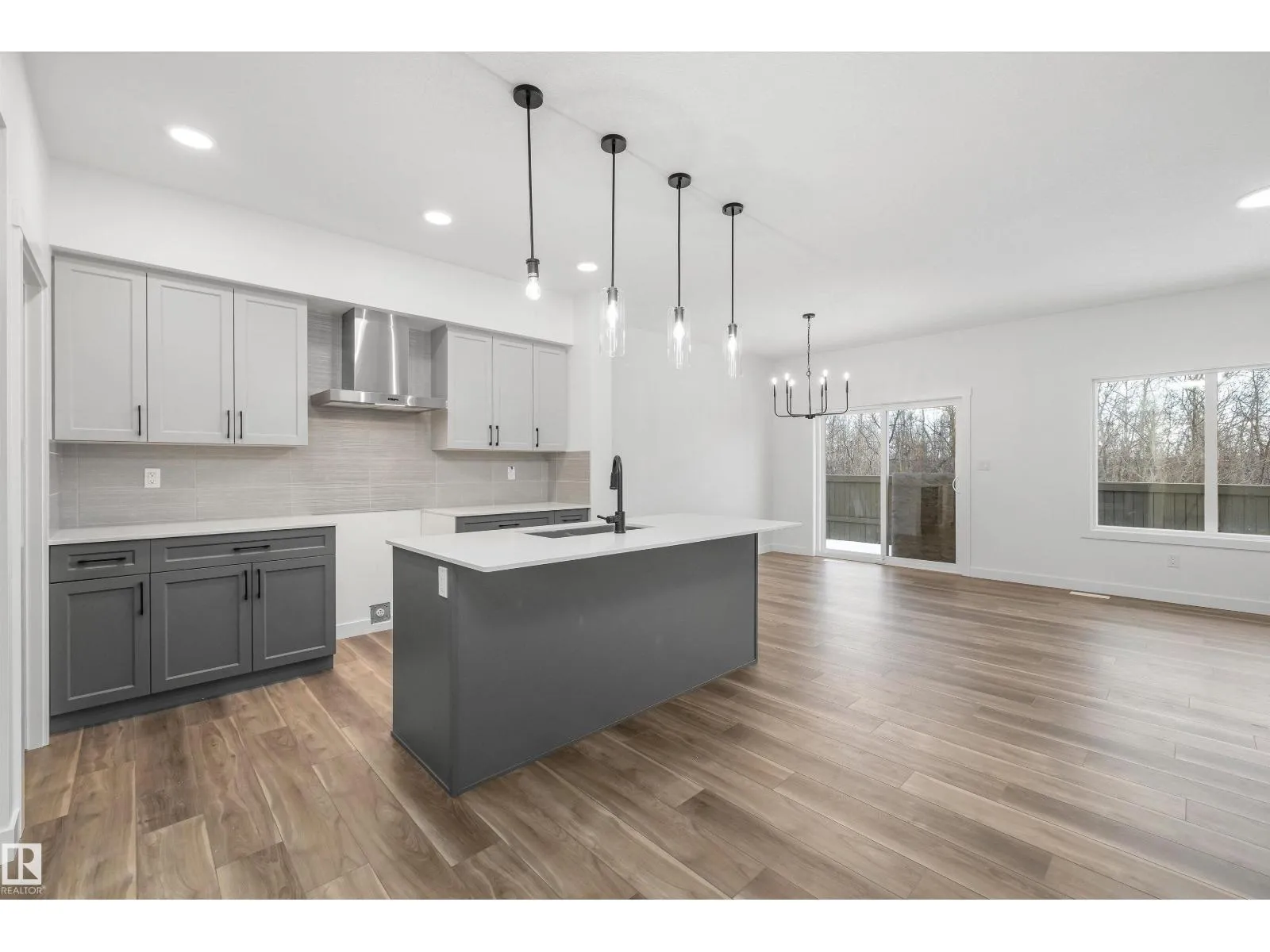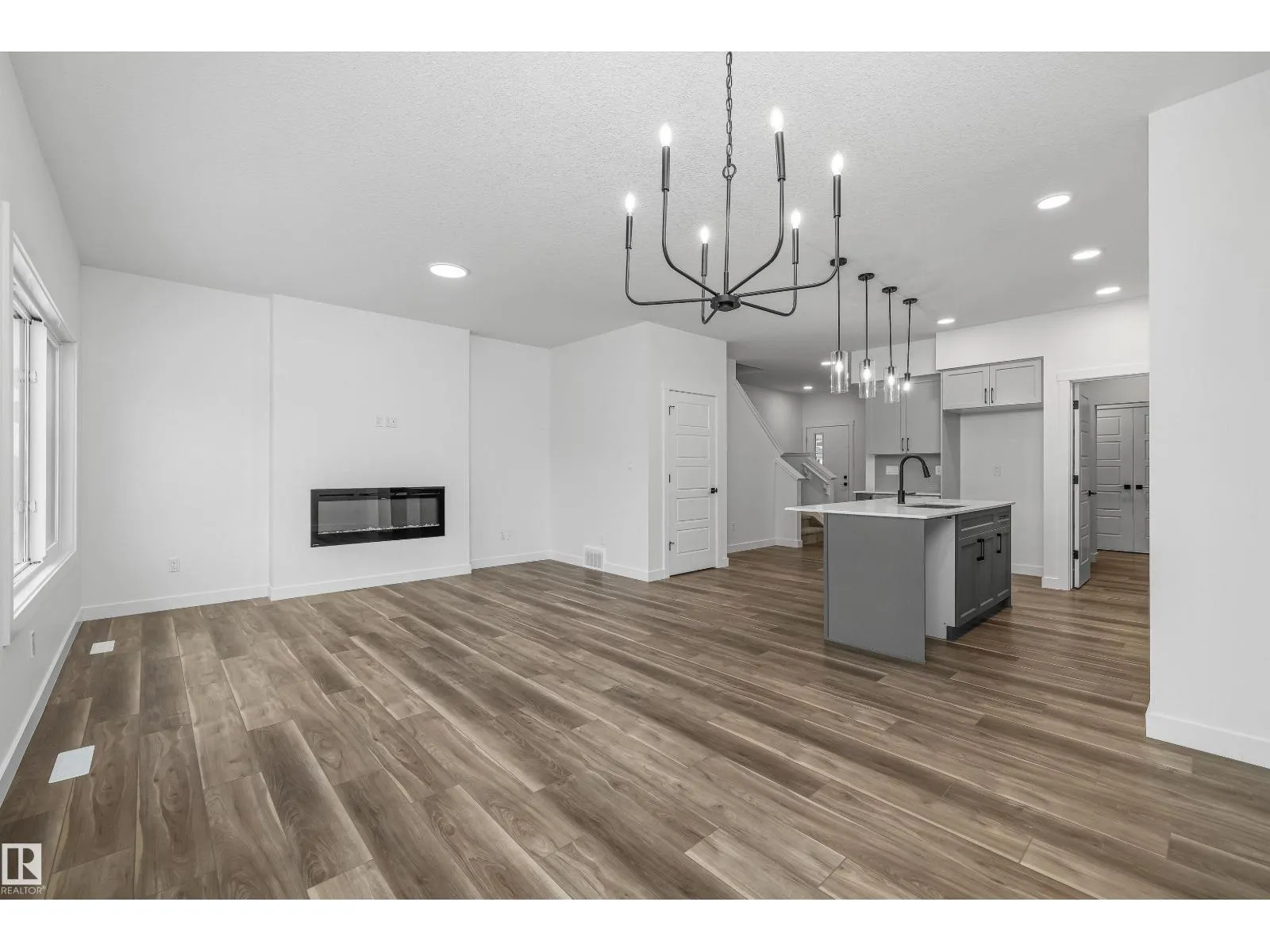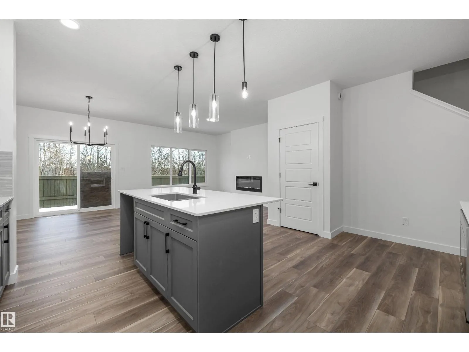 Built by Sterling Homes, this beautifully finished front-attached home in College Woods at Lakeview offers bright, refined living surrounded by trees, trails, and peaceful green space. Triple pane windows and 9’ ceilings create an airy main floor where a welcoming foyer leads past a half bath into a stylish kitchen featuring quartz countertops, a large island with seating, ceiling-height cabinetry,