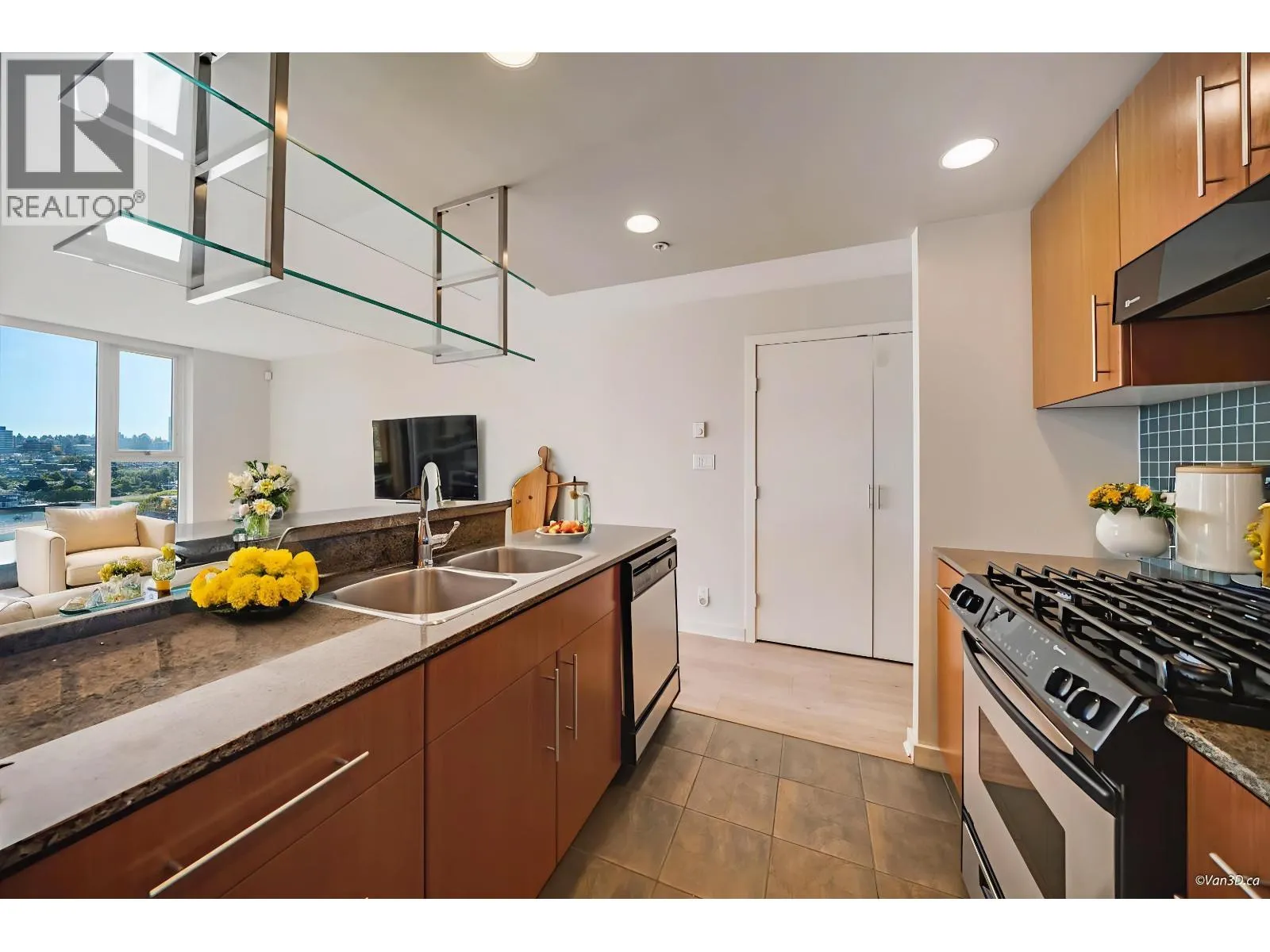 A premium waterfront residence at PARK WEST 2 in Yaletown. This luxurious corner suite offers spectacular views of George Wainborn Park and False Creek. The thoughtfully designed layout provides excellent separation between the entertainment areas and the two bedrooms. The light-filled living, dining and home office areas feature floor-to-ceiling windows that showcase breathtaking water and park view. Gourmet open kitchen,