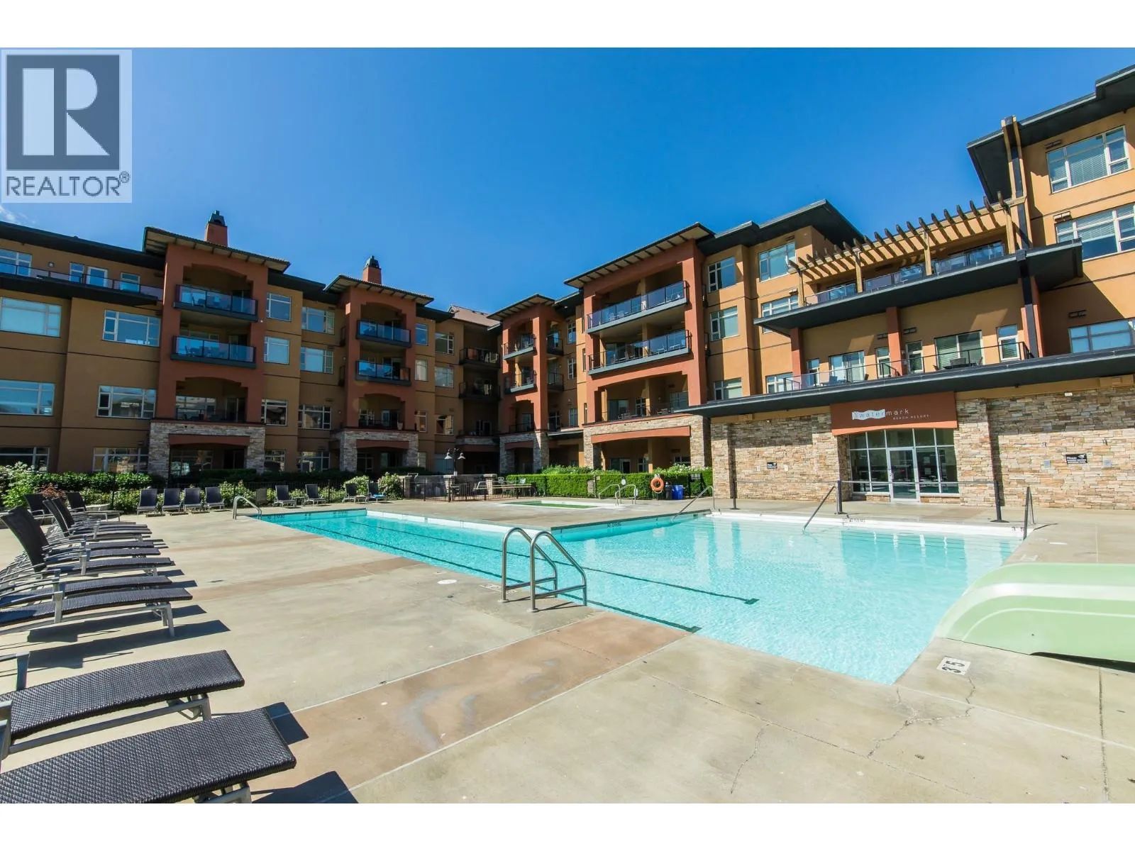 This premium large corner unit looks directly out over Osoyoos Lake! Comes fully furnished with granite counter tops, in suite laundry, covered deck facing east for a beautiful morning and shaded for evening BBQ. Watermark Beach Resort is the perfect recreational waterfront resort for family vacations, and rental pool income to off set costs. This beautiful waterfront complex boasts a