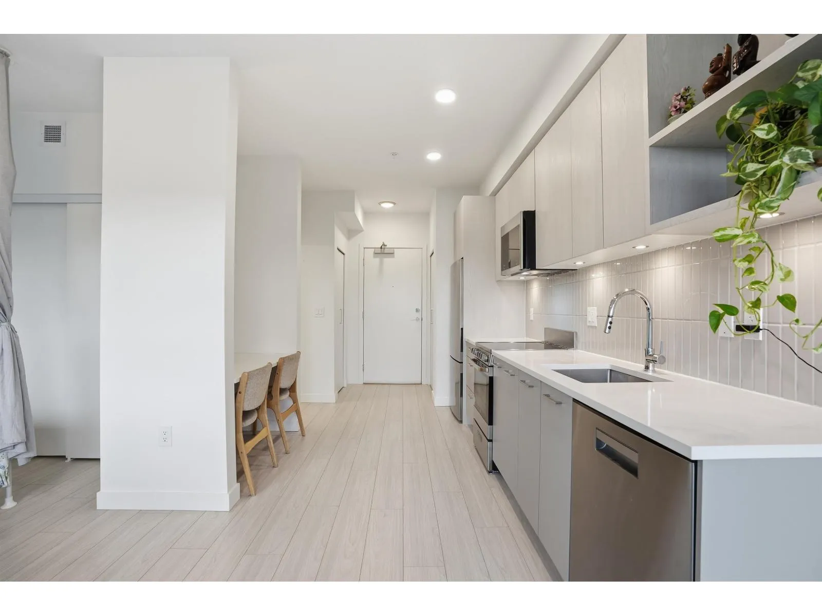 Welcome to a beautiful and bright centrally located studio unit in heart of North Surrey featuring one bathroom, open-concept kitchen layout with quartz countertops, a built-in nook, 8-foot ceilings, in-suite laundry, and a large balcony for fresh air and good view. Amenities include a party room, barbecue area, and playground, gym, lounge. .Just minutes away from the SkyTrain and 15