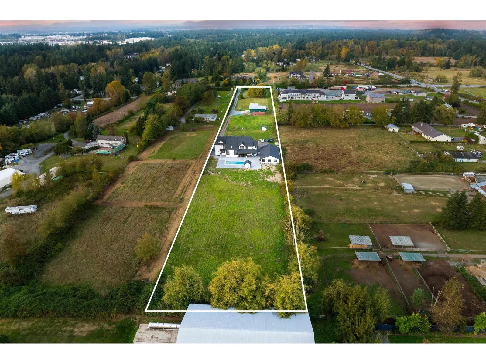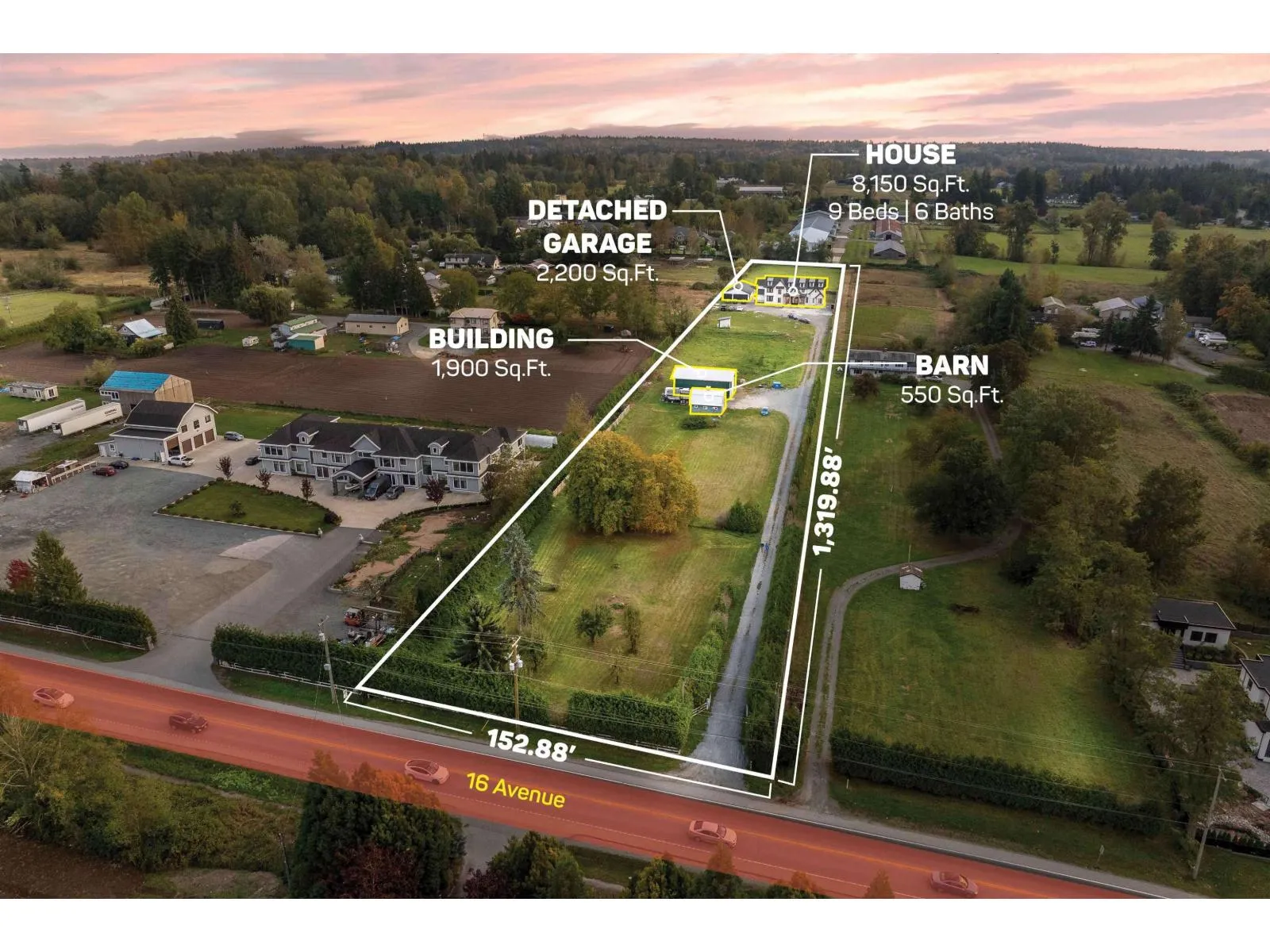 4.63 ACRES WITH ESTATE HOME AND MULTIPLE BUILDINGS. A long, gated driveway leads to an 8,150 SQ/FT custom-built estate home (2024), perfectly positioned for privacy and valley views. This luxurious home features 9 bedrooms, most with walk-in closets and private ensuites (6 bathrooms total), two grand staircases, open-concept living, a chef’s kitchen with walk-in fridge, and a recreation room with