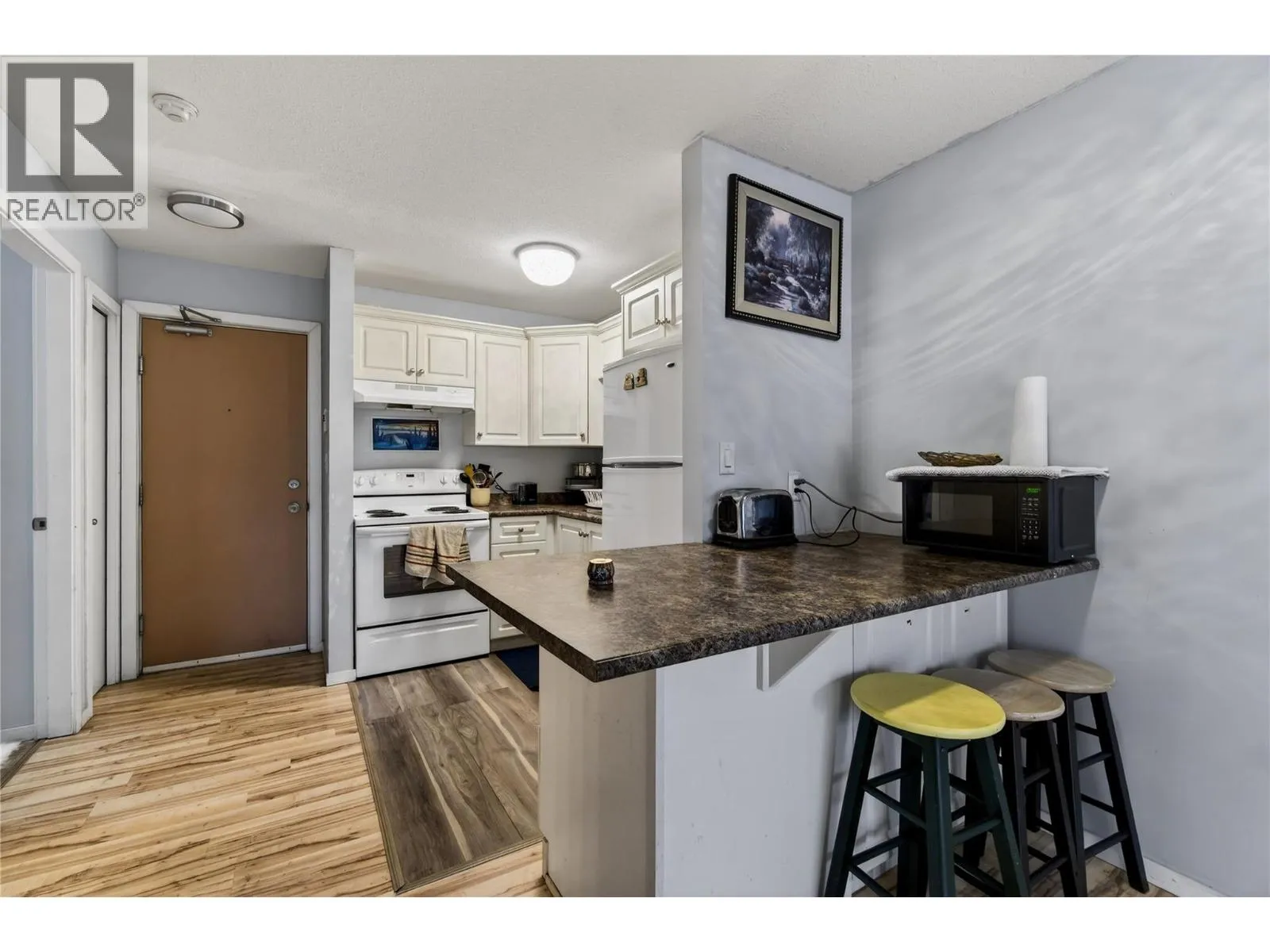 Step into downtown Vernon living with this bright, south-facing second-floor 1-bedroom condo at 3304 – 35th Avenue, where everything you need is just a short walk away. The open-concept unit features updated flooring, a private balcony, a bedroom with a wall-mounted A/C unit, practical storage, and a recently updated hot water tank, making it ideal for first-time buyers, downsizers, or