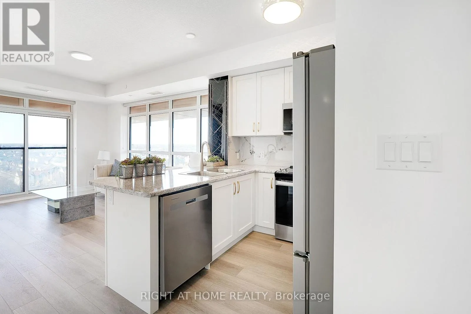 Modern Trend Living condo with 9-ft ceilings and an open-concept layout. Features ceramic tile flooring and bright LED lighting throughout. The stylish kitchen offers custom cabinetry, designer faucet, and laminate countertops with a backsplash, while the bathrooms boast quartz countertops and spa-inspired premium fixtures. Enjoy a feature wall for your TV, a French balcony, and an owned locker for extra