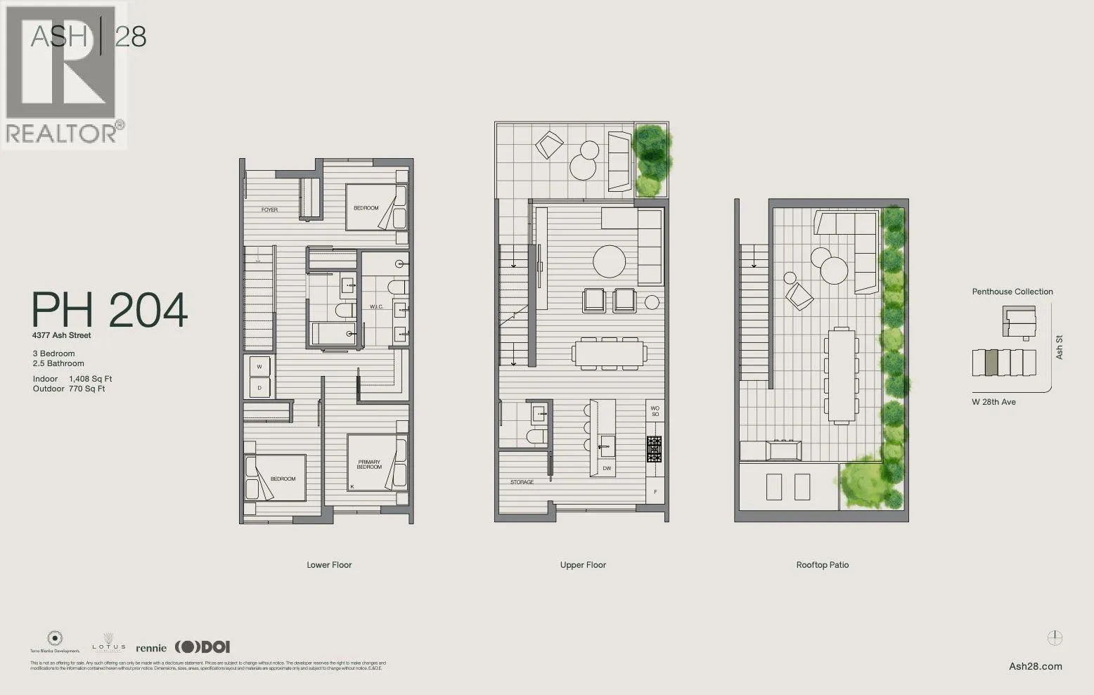 ASH | 28-Perched on one of the neighbourhood’s highest points, this 3-bedroom, 2.5-bath home blends the spacious feel of a single-family home with refined West Coast design. The Penthouse Collection reimagines two-level living with a seamless connection between indoor and outdoor spaces. Floor-to-ceiling glass opens the living area onto a generous patio that flows directly to a private rooftop terrace-no