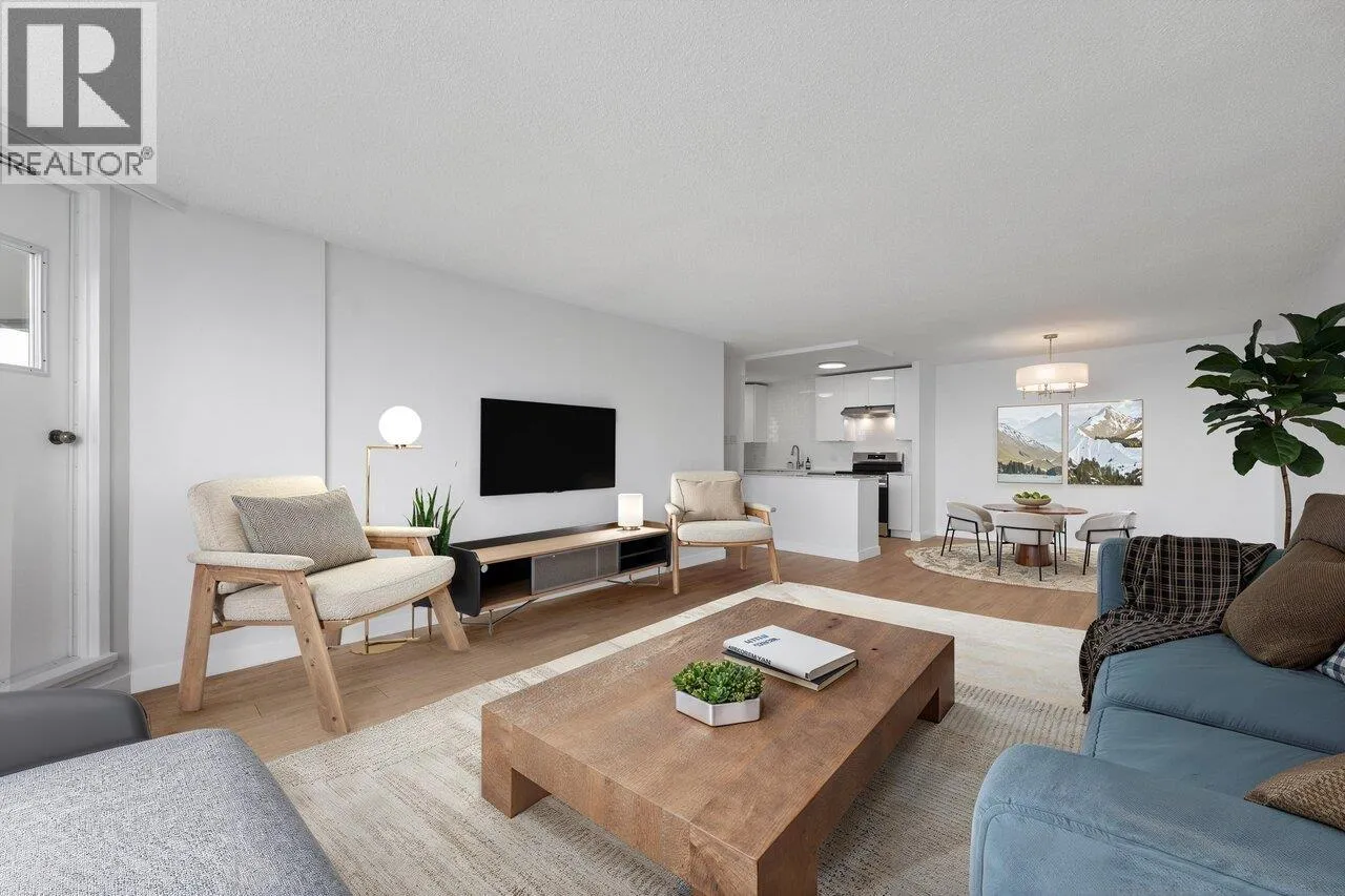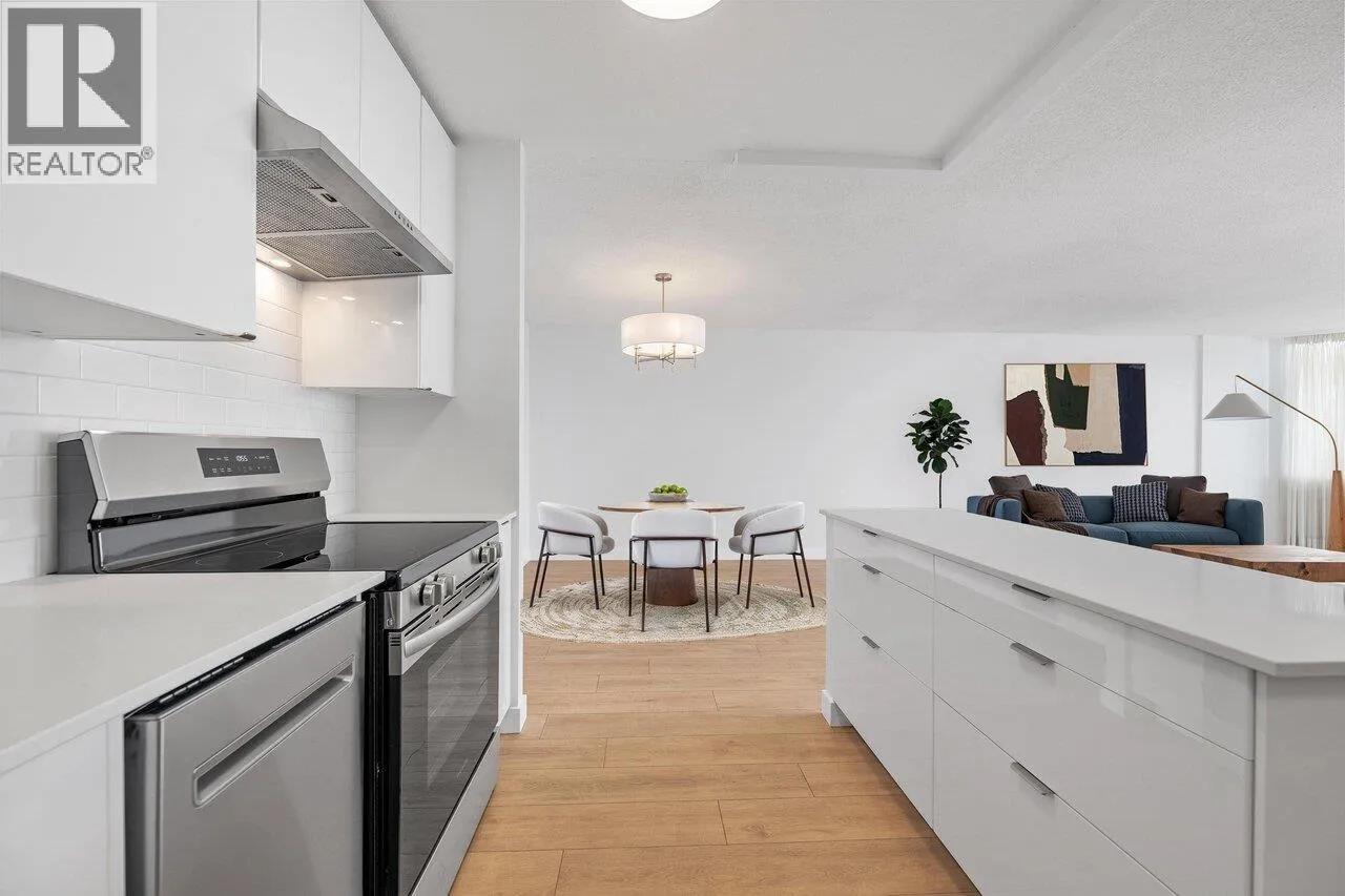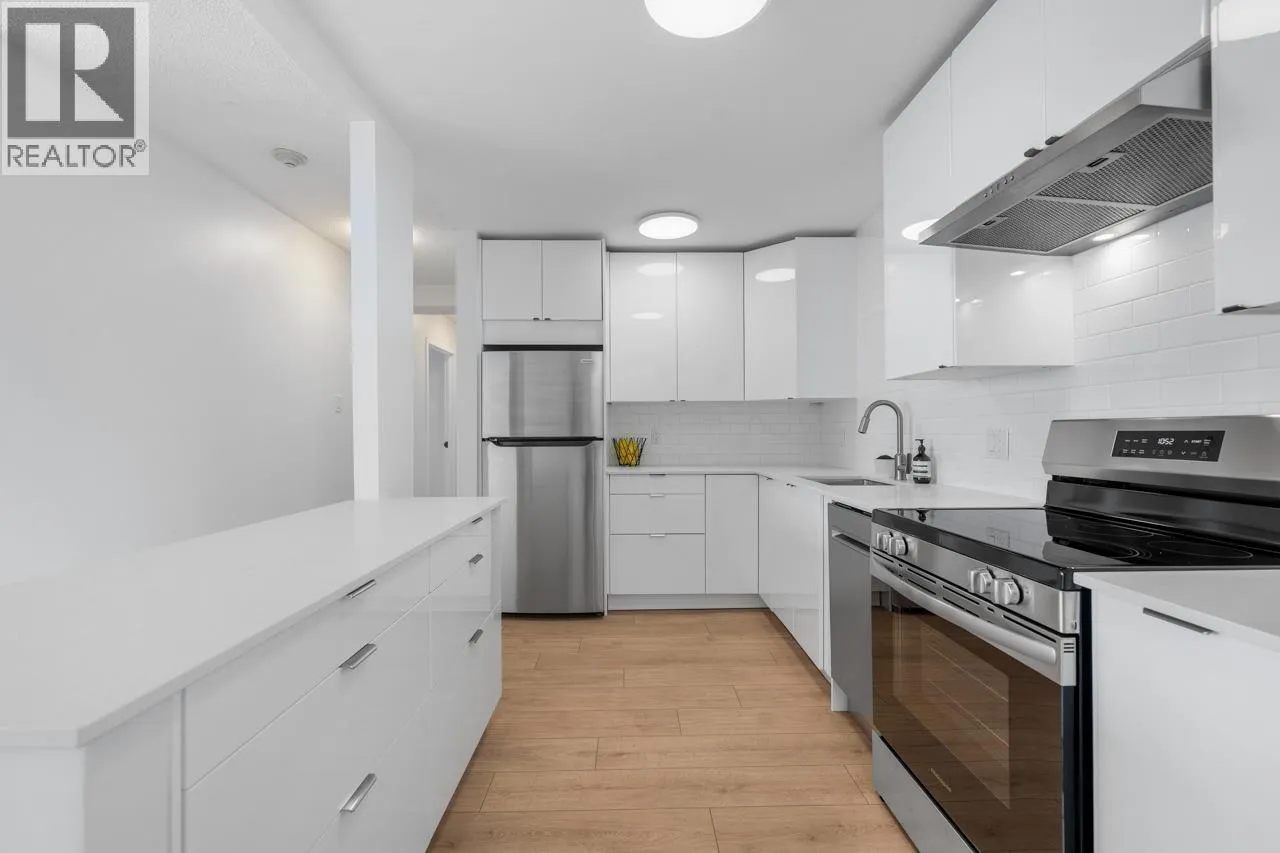 Bright, modern & spacious! This 2-bed RENOVATED CONCRETE condo offers 1,100+ SF of OPEN CONCEPT LIVING featuring a sleek white kitchen with quartz counters, stainless appliances & large central island that flow seamlessly into the living & dining space. South-facing BAY WINDOWS flood the home with natural light & frame breathtaking views from Mount Baker to the Salish Sea, the