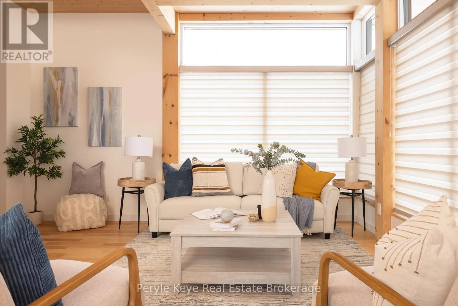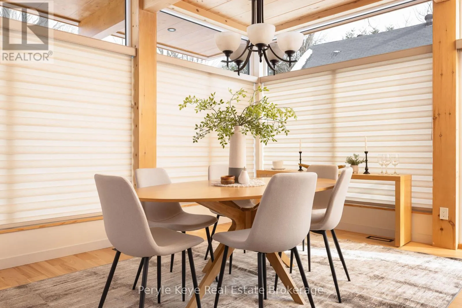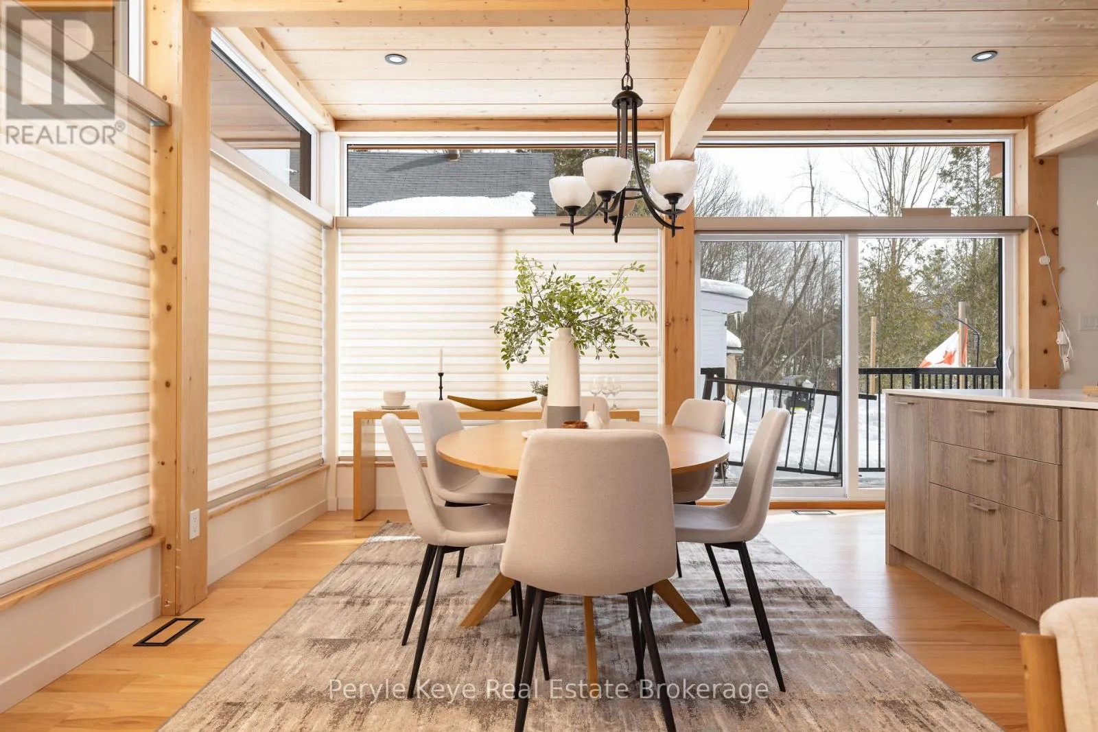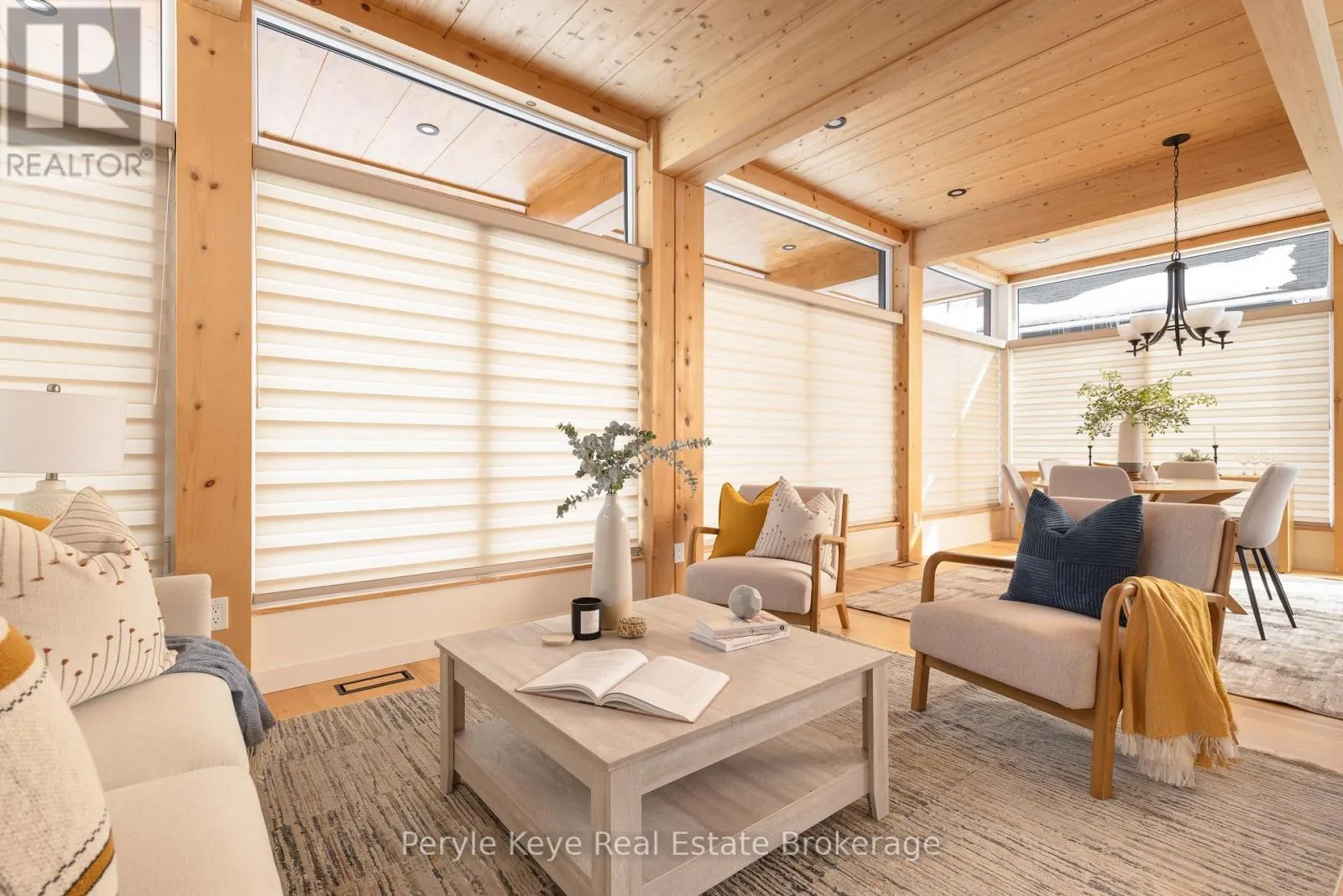 Morning light pours through the wall of windows, stretching across the main living space as the rhythm of the day begins outside. Across the street, the park fills with early dog walkers and the soft pop of a pickleball rally echoes from the nearby courts. A short walk away, the river moves steadily after flowing over the falls in the