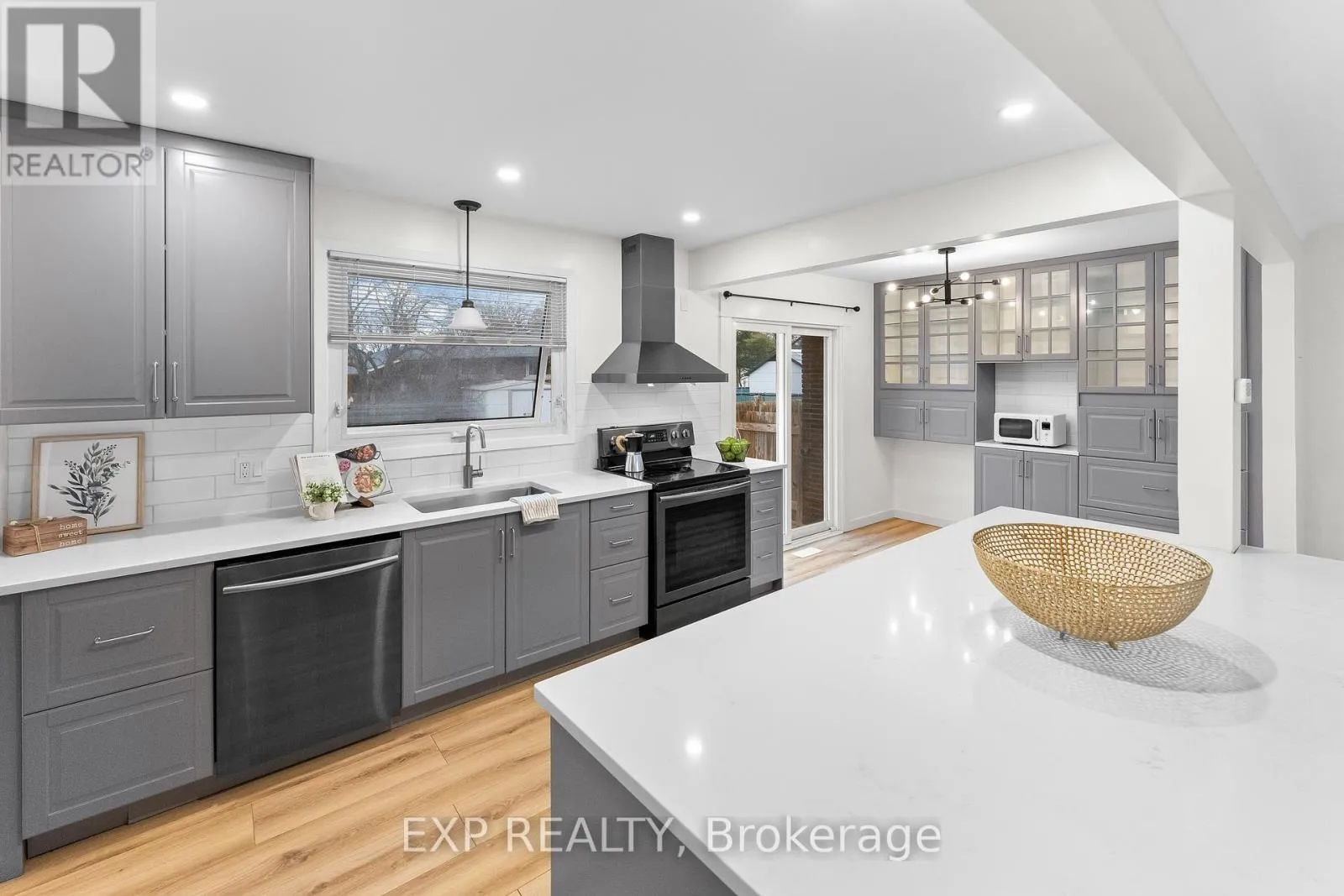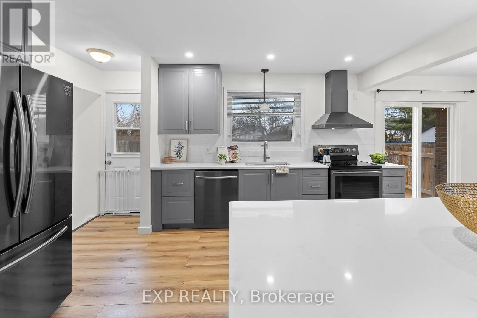 open concept kitchen and living area renovated approximately two years ago. The kitchen includes quartz countertops, grey cabinetry, subway tile backsplash, stainless steel appliances and a centre island with seating. Large front windows provide natural light and sliding doors off the kitchen lead to the backyard. The upper level includes three bedrooms and a full bathroom. The lower level provides a finished recreation or family room, while the sub basement includes an office that may also function as a fourth bedroom depending on use. The backyard includes a deck completed in 2025 and a lawn and garden sprinkler system installed approximately six years ago. The property provides space for outdoor use along with a private driveway that accommodates up to four vehicles. Recent updates include furnace replacement approximately seven years ago, insulation upgraded at the same time, finished basement completed approximately five years ago, kitchen renovation completed approximately two years ago and kitchen appliances replaced within the past three to four years. Convenient access to parks, schools, shopping, Lake Ontario areas and major routes including the QEW. (id:62650)