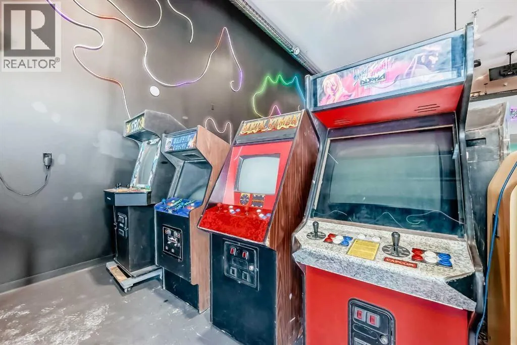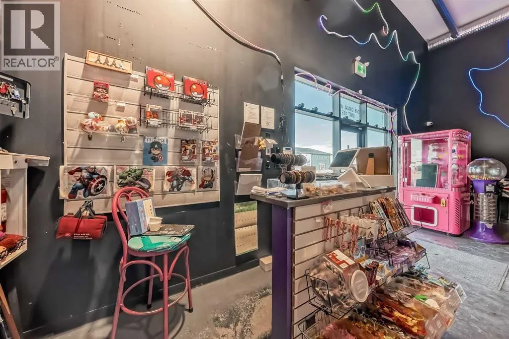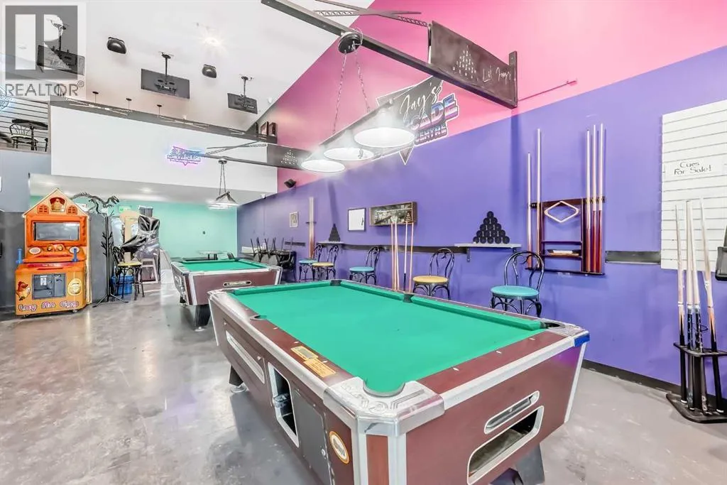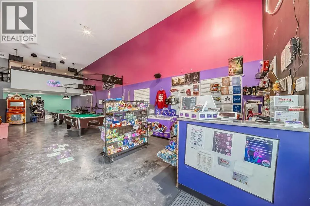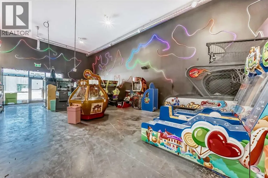 Prime commercial location just off Highway #1. This 2,000 sq ft main floor plus 600 sq ft mezzanine commercial condo is currently set up as an arcade entertainment venue with licensed alcohol service and concession/bar area.The space includes two washrooms, air conditioning, on-demand hot water, extensive electrical outlets, high-end stereo system, security system with 8 cameras, and double rear doors