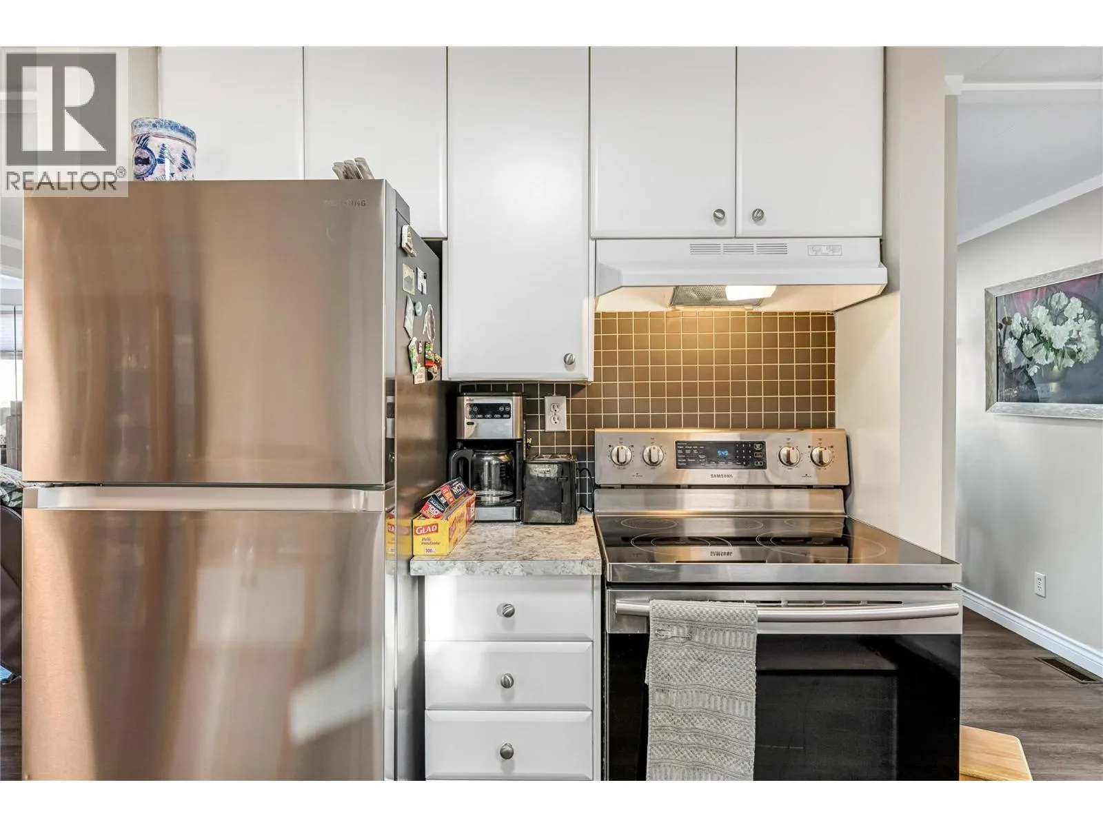 Situated in a convenient and well-established neighbourhood, this well-cared-for 2-bedroom, 2-bathroom manufactured home delivers comfortable single-level living with everyday amenities just minutes away. Clean, functional, and inviting, the layout is designed for easy living and effortless flow. The bright living room is filled with natural light from large windows, creating a warm and welcoming atmosphere. The kitchen and dining area