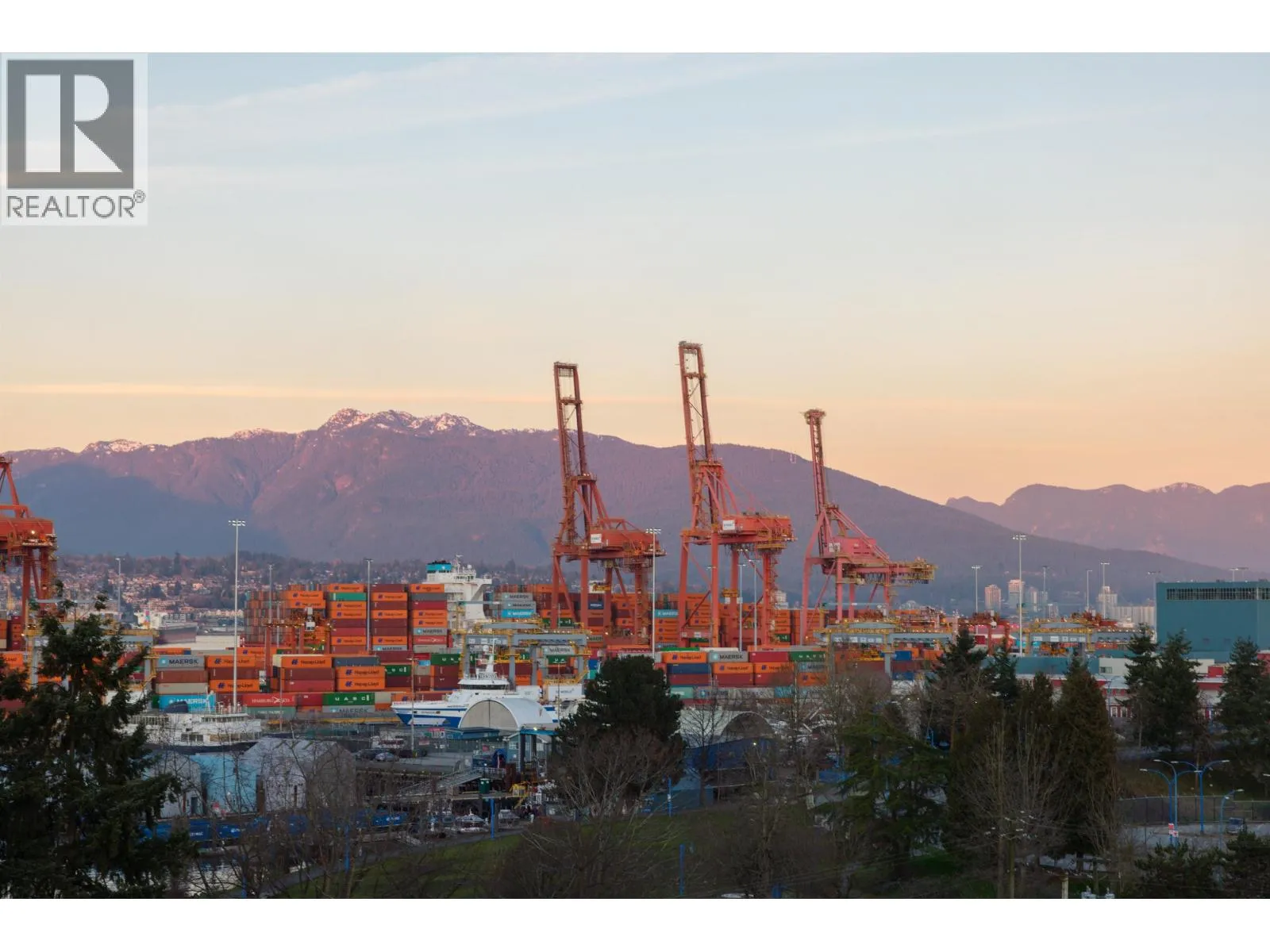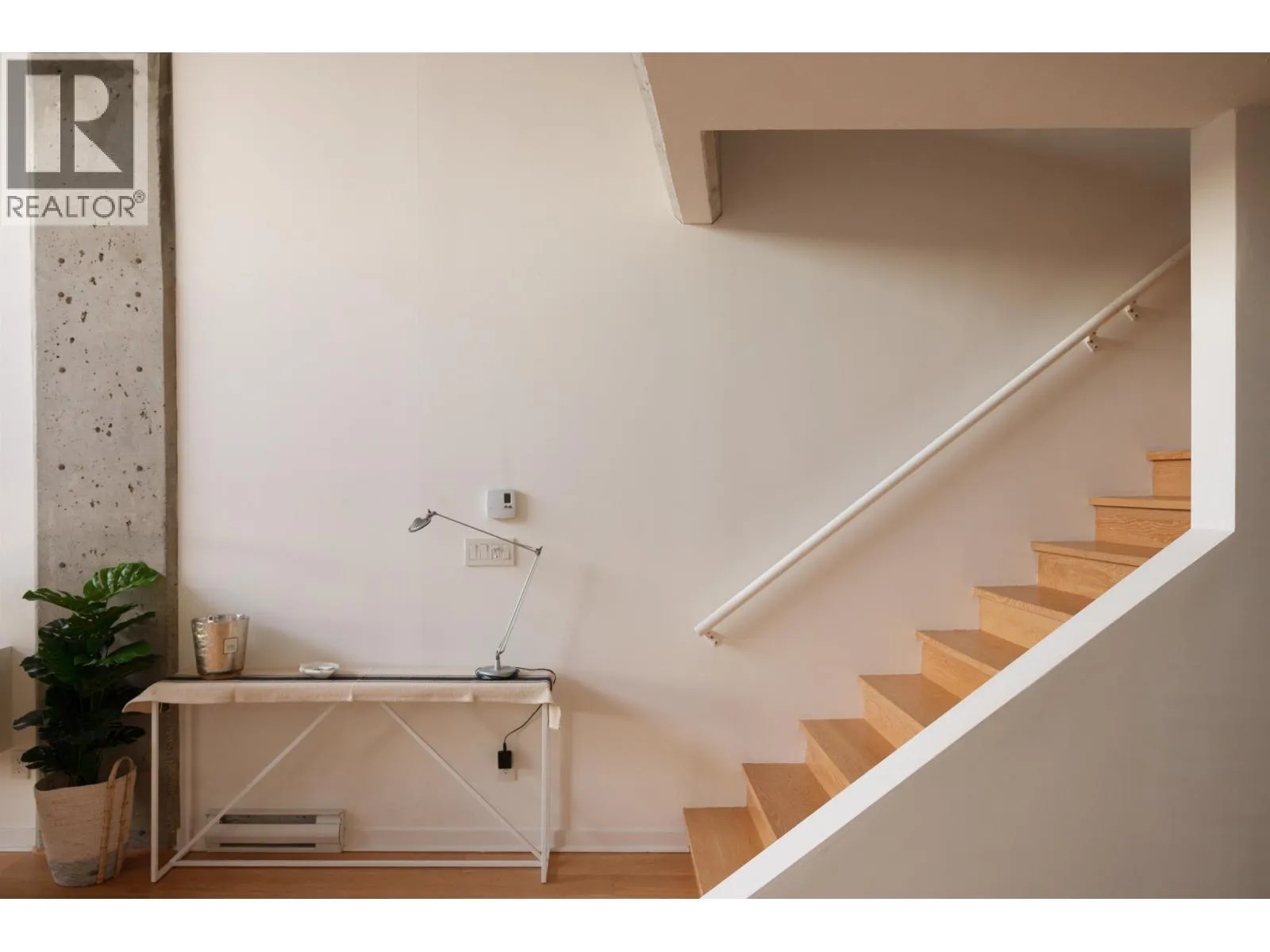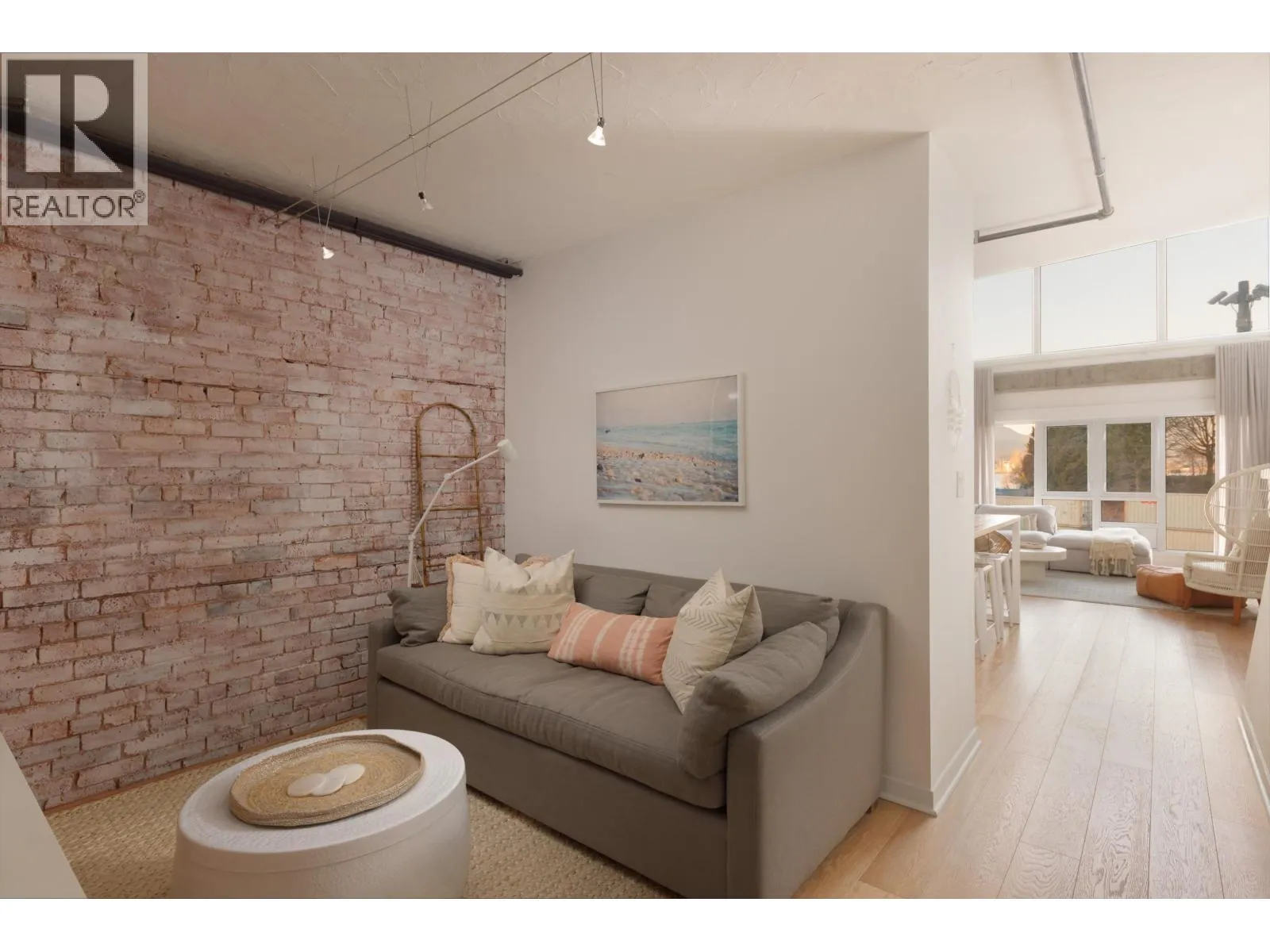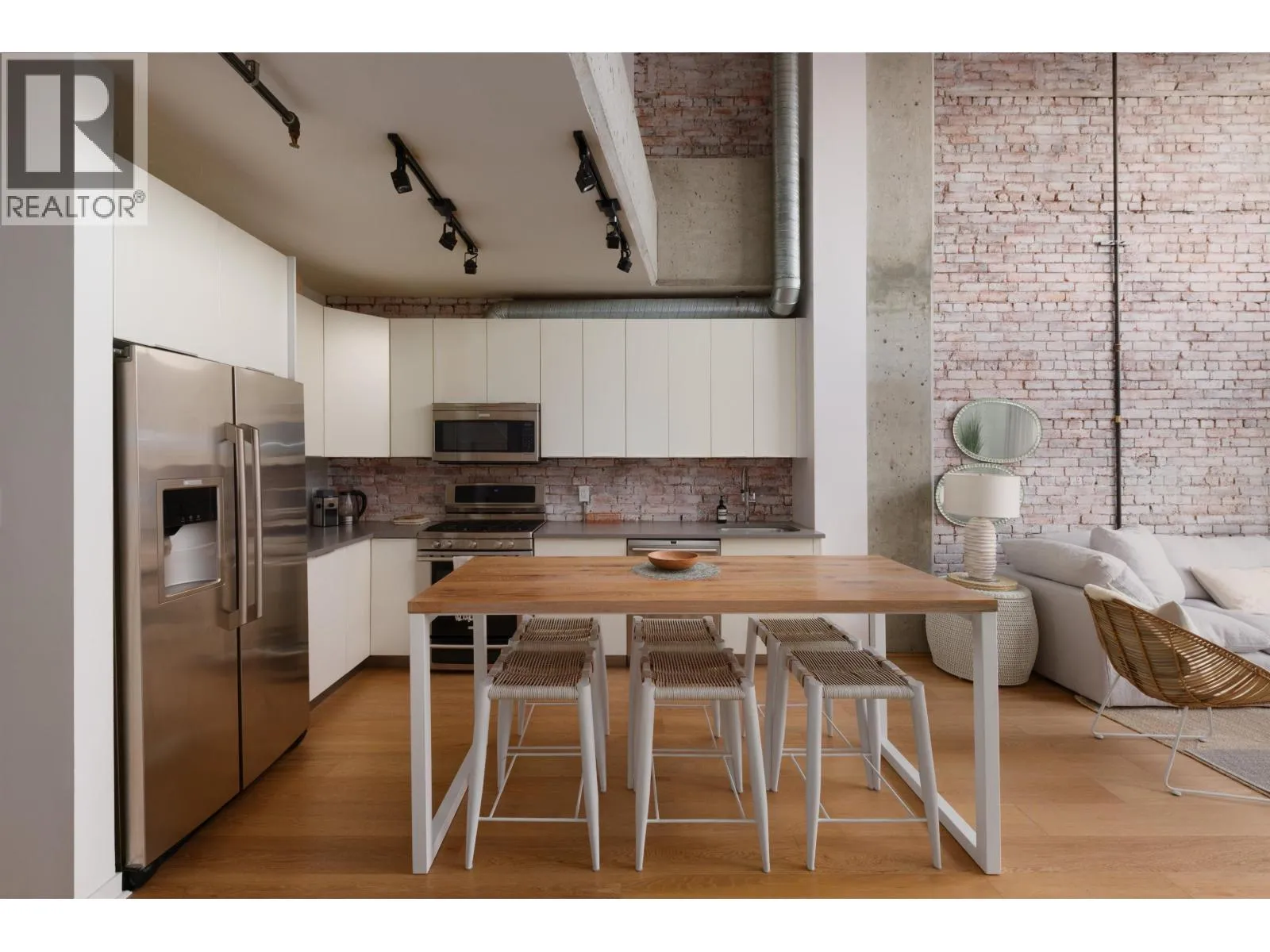 Heritage loft living, elevated. This two-level Gastown loft sits on one of the best blocks in the city, with 20-foot ceilings, exposed original brick, exposed concrete, and water views of Burrard Inlet and the North Shore mountains. The living room anchors the main level around a fireplace with custom floating storage units on both sides and a custom mantle, the