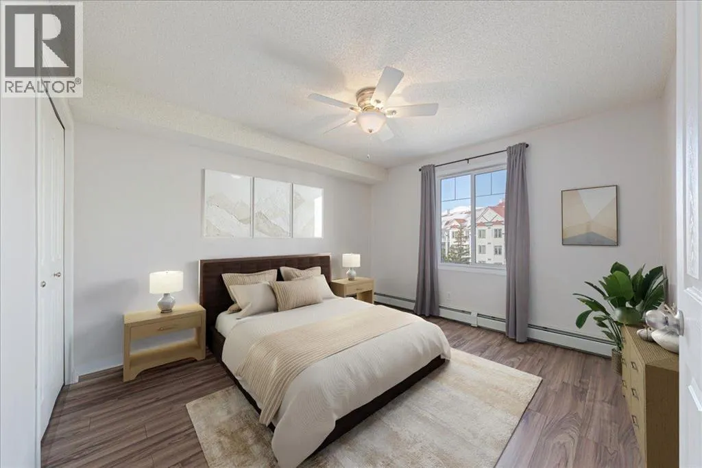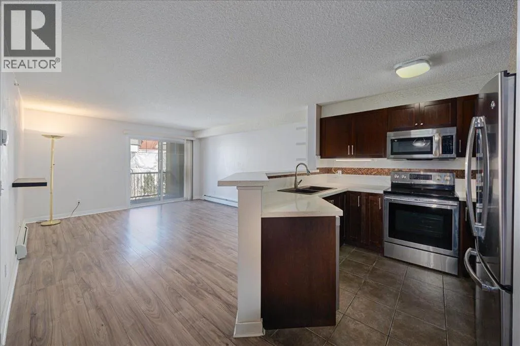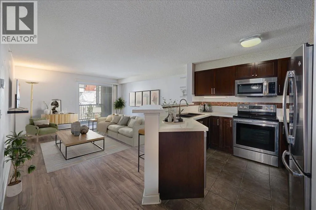 Welcome to this stylish top-floor condo in the highly desirable community of Royal Oak in NW Calgary. This beautiful updated two bedroom residence features a bright open concept, open-concept layout designed for comfortable modern living. The kitchen showcases stainless steel appliances, striking recycled glass countertops with a matching backsplash, and elegant under-cabinet lighting. Hickory laminate flooring flows throughout the space.