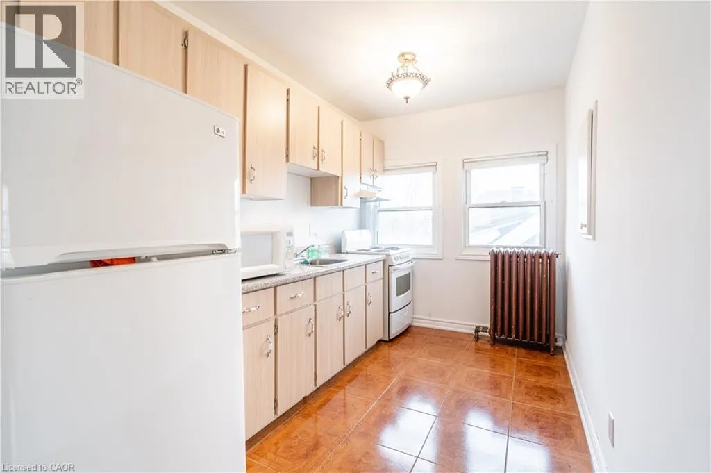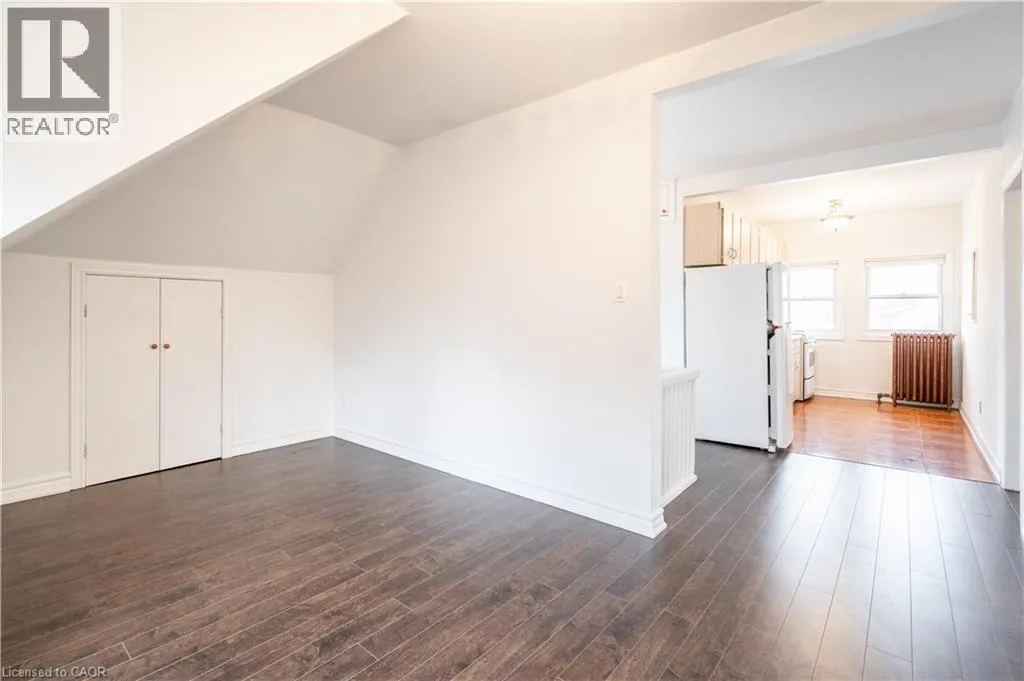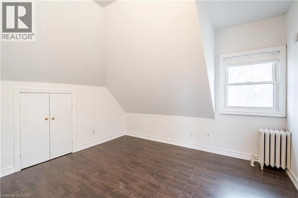 Bright 2-bedroom, 1-bathroom third floor Unit 3 located in a large brick home on a quiet tree-lined street in the Gibson neighbourhood. Conveniently situated near restaurants, shops, parks, and transit. Heat and water included. Hydro separately metered and paid by tenant. Shared laundry in the basement, pay per use. One parking space available in driveway (tandem parking with other tenants;