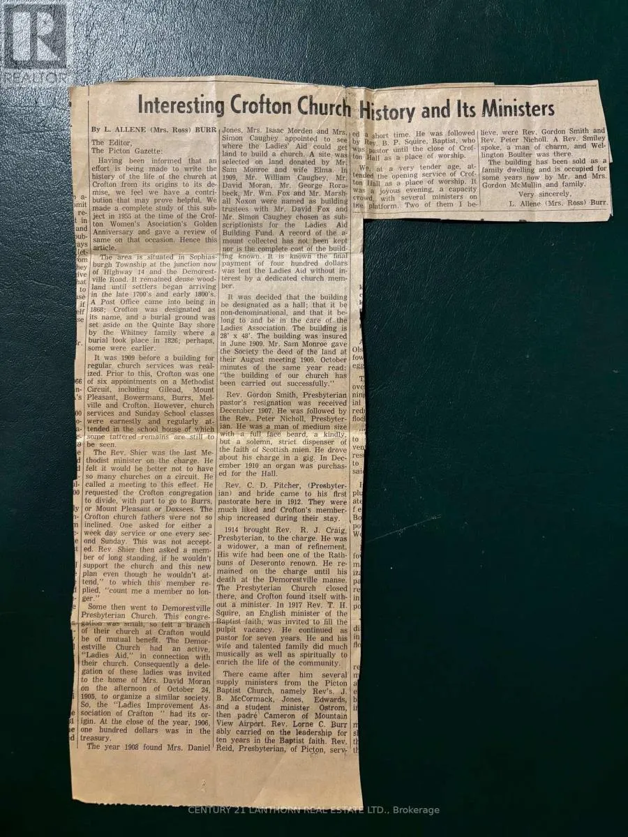 You have not seen hardwood floors like this before! Step into a truly one-of-a-kind home rich in history and thoughtfully adapted for modern living. Originally built in 1909 as the non-denominational Crofton Church & Meeting Hall, this striking conversion is ideally located between Picton and Belleville, offering both serenity and convenience. Set on a peaceful quarter-acre lot, the property blends