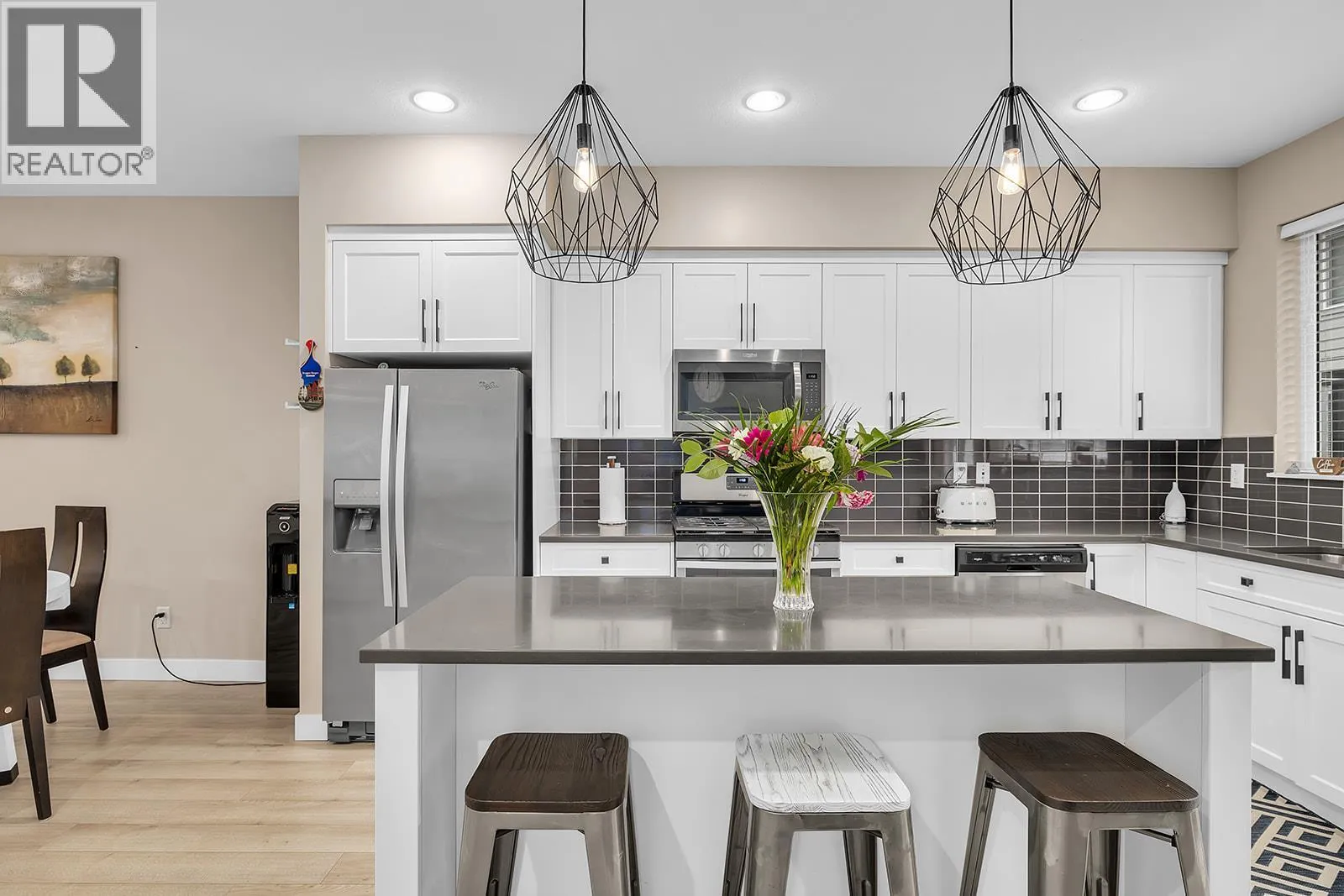 Thoughtfully upgraded 3 bedroom, 3 bath home offering style, function, and lasting value in a sought after Shannon Lake setting. The open concept main level features 9 foot ceilings, wide plank laminate flooring, and a bright kitchen complete with quartz countertops, stainless steel appliances, gas range, and soft close cabinetry. Built in dining room storage with a wine fridge adds