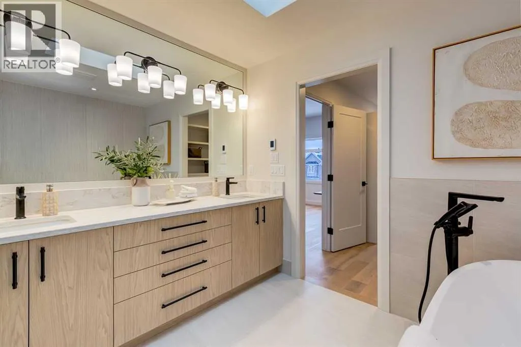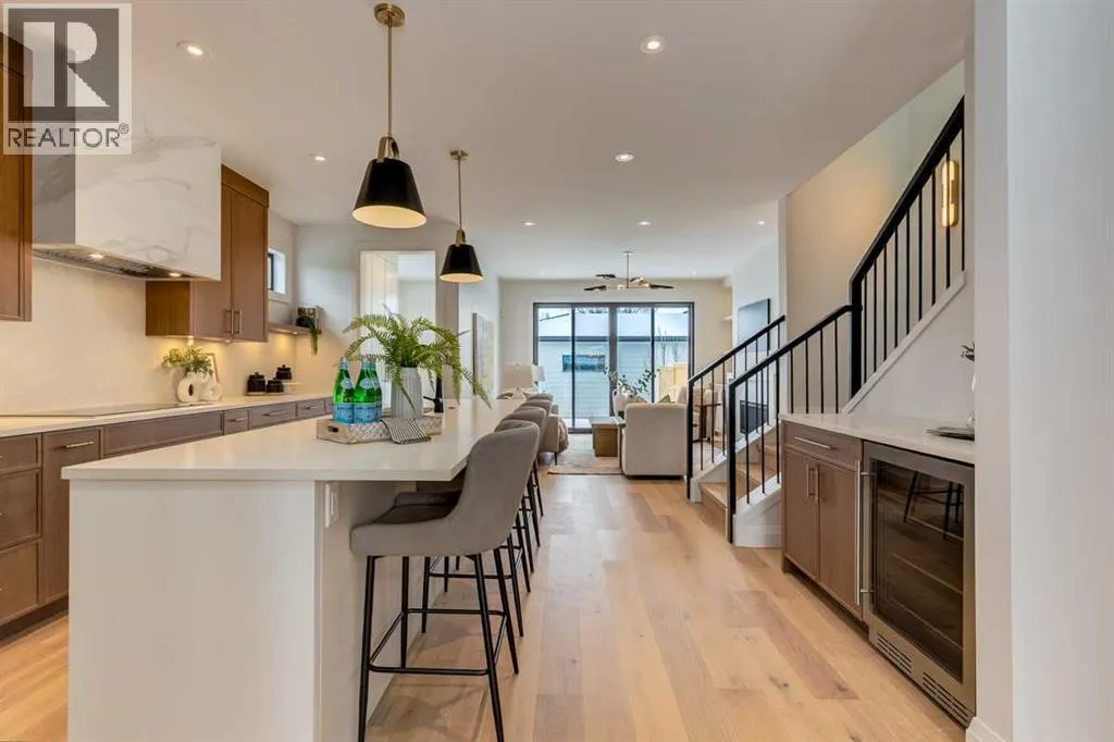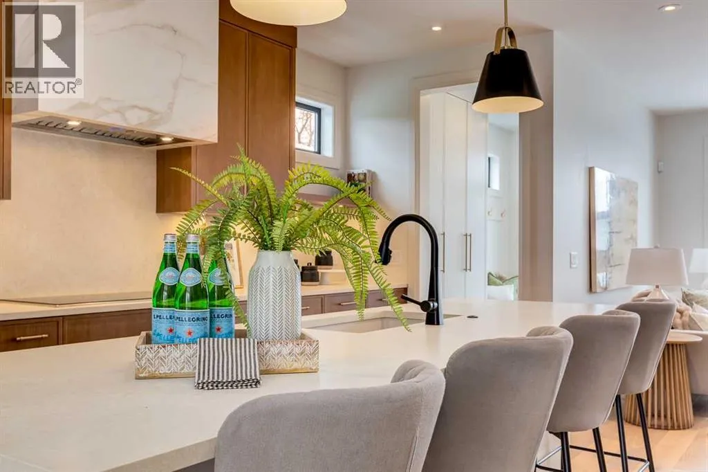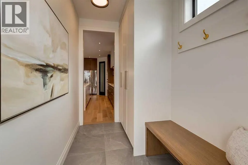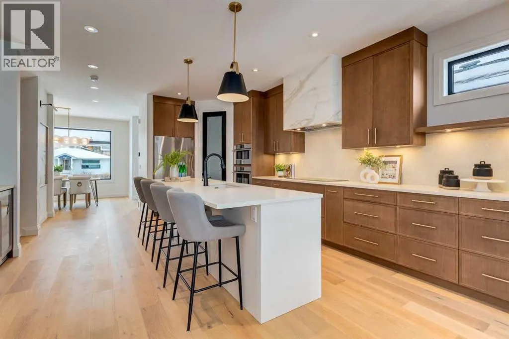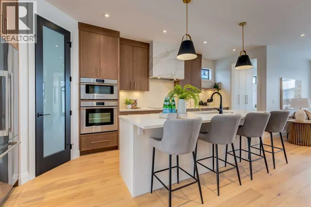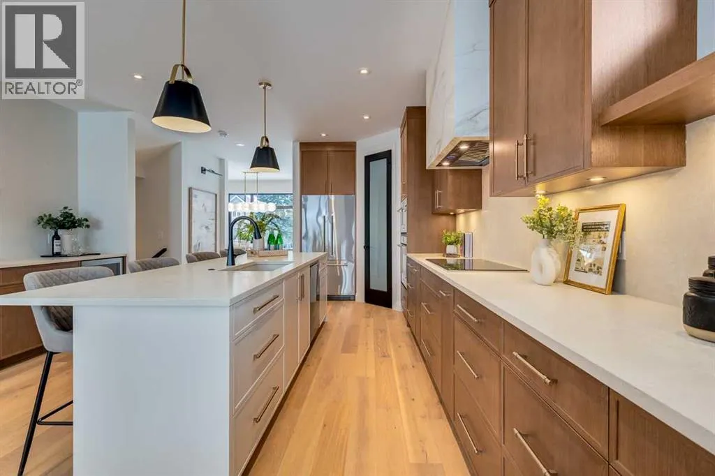 both peace of mind and timeless appeal. It’s packed with upgrades throughout and offers a truly refined living experience. Step inside to a welcoming foyer and dining room that flow seamlessly into an open-concept kitchen and living area, ideal for both everyday living and entertaining. The kitchen is equipped with high-end Fisher & Paykel appliances, stone countertops throughout, a large island, walk-in pantry, and stunning white oak rift-cut cabinetry. Extensive custom built-ins are thoughtfully integrated into the foyer, mudroom, and living room, adding function and elegance throughout the main floor. The living room features a porcelain-clad fireplace complete with Frame TV and sliding patio doors leading to a spacious maintenance-free composite deck. A functional mudroom off the rear entry leads directly to the garage, making daily routines effortless. Upstairs, a dramatic skylight floods the stairwell and bonus area with natural light, creating the perfect space for a desk or reading nook. The primary bedroom is impressively spacious, creating a true retreat with a spa ensuite that includes a standalone tub, steam shower with handheld, and heated floors. The main bath offers double sinks and linen storage, while upstairs laundry provides added convenience. Custom built-in closets are found throughout. The fully developed basement includes a large rec room with dry bar and bar fridge, a bedroom suite with walk-in closet and ensuite, and hydronic in-floor heating paired with an on-demand boiler for year-round comfort. A central AC/heat pump system adds modern efficie ncy. Outside, enjoy the fully landscaped private sunny yard and an oversized 21′ x 21′ garage, insulated and drywalled to fit a truck. The exterior blends stone, cedar accents, and Hardie siding for striking curb appeal. This home is move-in ready and exemplifies the craftsmanship, quality, and design that make Treehouse Developments a standout builder in Calgary. It’s rare for a Treehouse-built home to hit the market, making this a special opportunity to own a truly exceptional property. (id:64429)