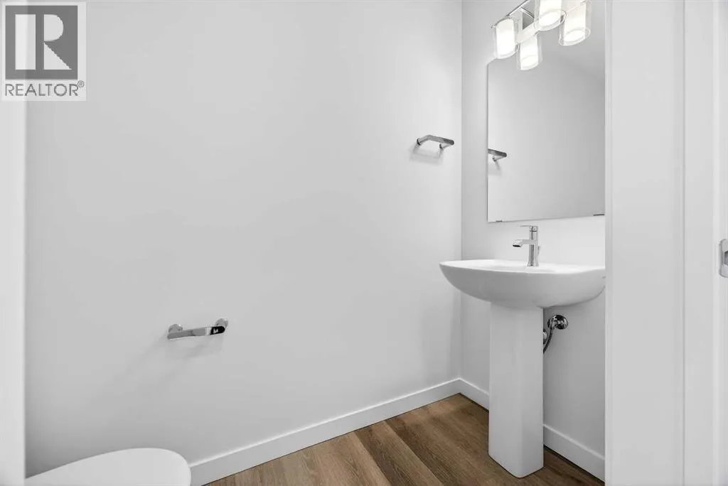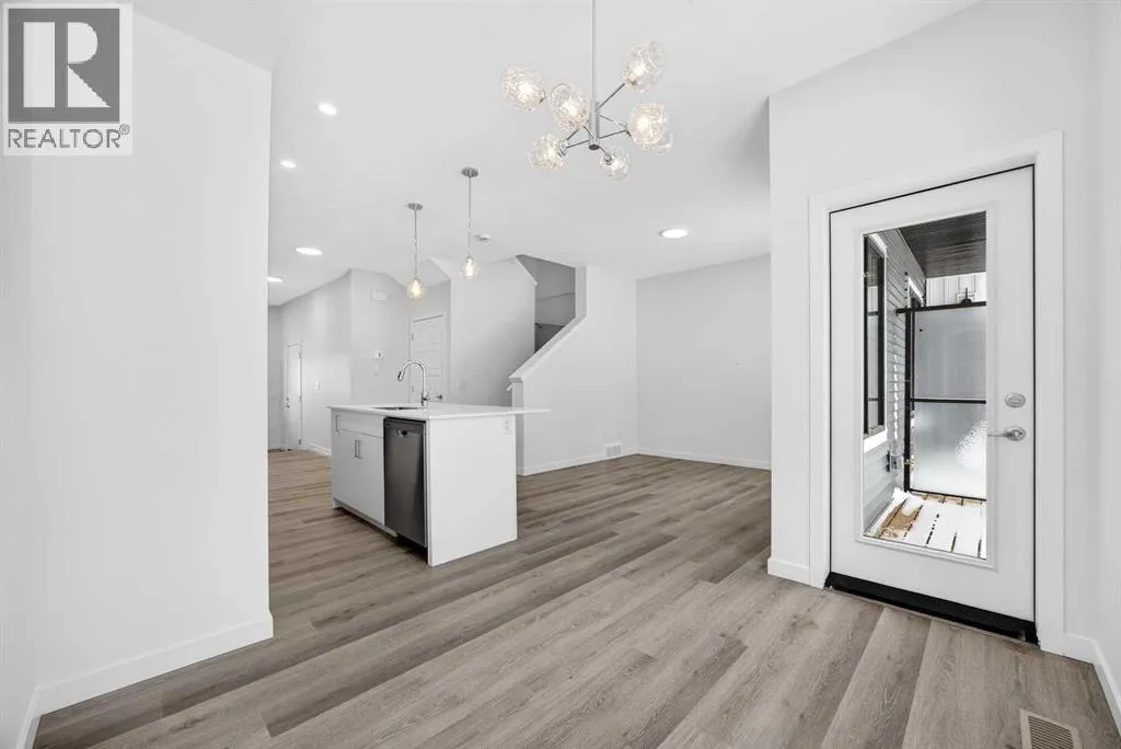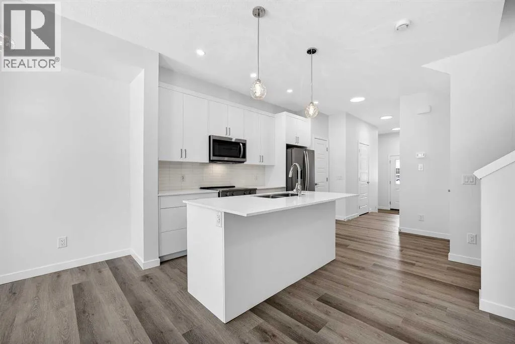 balance of natural surroundings and city connectivity. Proximity to Sirocco Golf Club further enhances the open, green feel of this growing community.This fully finished two-storey townhome offers exceptional flexibility with four bedrooms and four bathrooms across three levels of developed living space. The main floor features a bright open-concept layout connecting the kitchen, dining area, and living room, creating a comfortable space for both everyday living and entertaining. The kitchen is beautifully finished with modern slab-style cabinetry featuring 42” upper cabinets, a full bank of drawers, soft-close doors, polished white quartz countertops, tile backsplash, stainless steel Whirlpool appliances, and a polished chrome Moen high-arc faucet with pull-down sprayer. Luxury vinyl plank flooring runs throughout the main living areas, bathrooms, and laundry room, while contemporary lighting selected by professional designers completes the modern interior.Upstairs, you’ll find three bedrooms including a spacious primary suite with a private full ensuite. An additional full bathroom and the convenience of upper-floor laundry enhance the functionality of the upper level.The fully finished lower level expands the home’s versatility with a fourth bedroom, full bathroom, and family room — ideal for guests, teenagers, a home office, or additional living space.Additional features include a single attached garage with opener, high-efficiency gas furnace, digital thermostat, 50-gallon electric hot water tank, energy-efficient dual-pane windows with low-E coa ting, sound attenuation system for increased privacy between units, and a natural gas BBQ line on the patio or balcony. Durable exterior cladding with vinyl siding and fibre cement panels, along with lifetime limited warranty roof shingles, ensures long-term performance and curb appeal.Offering modern construction, thoughtful design, and a location centered around green space and lifestyle, this home represents an outstanding opportunity to own a brand-new property in one of Calgary’s emerging south communities. (id:62650)