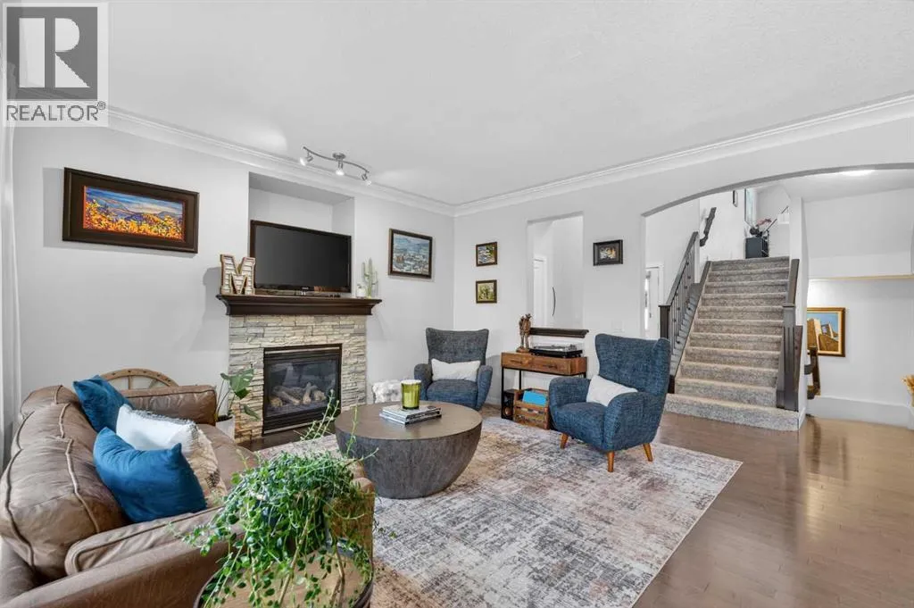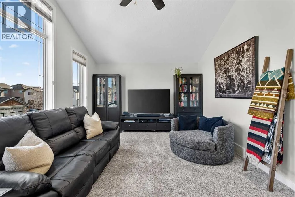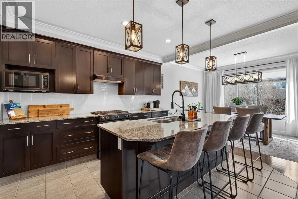 time with family. Situated on a quiet street in a cul-de-sac, this home features 9-foot ceilings on both the main level and basement, creating an open and airy feel throughout. As you enter the home, you are welcomed into a bright and spacious main floor featuring espresso maple hardwood flooring and a warm, inviting living room centered around a cozy gas fireplace. The kitchen is the heart of the home, showcasing espresso maple cabinetry, granite countertops, a gas stove, and a large island with breakfast bar, making it perfect for preparing meals or gathering with guests. The adjacent dining area leads directly to a large deck with pergola and gas BBQ hookup, providing the ideal space to enjoy outdoor dining and relaxing evenings. A convenient walkthrough pantry connects the kitchen to the mudroom and laundry area, offering easy access to the double attached garage and making everyday tasks like bringing in groceries effortless. Upstairs, the home continues to impress with a large bonus room featuring vaulted ceilings, creating a great space for movie nights or a kids’ play area. The spacious primary retreat offers beautiful mountain views, a walk-in closet, and a luxurious 5-piece ensuite complete with a jetted tub and double vanity. Two additional bedrooms and a full 4-piece bathroom complete the upper level. The fully finished walkout basement adds even more living space with a recreation area, an additional bedroom, and a 3-piece bathroom, making it ideal for guests or extended family. Step outside to the backyard to find a stamped concrete patio with a Salt Water Artic Spa with Spaboy hot tub, creating a perfect outdoor retreat. Beyond that, you will enjoy the large fully fenced backyard with a large grassed area and a wood constructed shed. Both the garage and basement storage room feature epoxy floors, elevating the look and feel of the spaces. Additional features include central air conditioning (2021), AO Smith 199,000 btu/h tankless water heater (2024), Whirlpool water softener, CAT5 wiring, and sump pump. The furnace was recently serviced with a new fan and heat exchanger. Located close to parks, playgrounds, schools, ponds, and shopping, this home offers both comfort and convenience in one of Cochrane’s most desirable communities. Book your showing today! (id:62650)