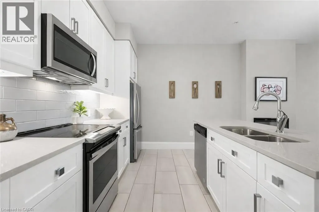 Sophisticated 3-bdrm, 3-storey townhouse nestled in sought-after Metalworks complex in vibrant downtown Guelph! Perfect blend of condo amenities W/privacy & space of a townhouse, this home promises a lifestyle of convenience & luxury. You’re welcomed by open-concept living space W/10ft ceilings. Living room W/laminate floors & expansive windows. The space seamlessly flows into dining area where fireplace sets the tone