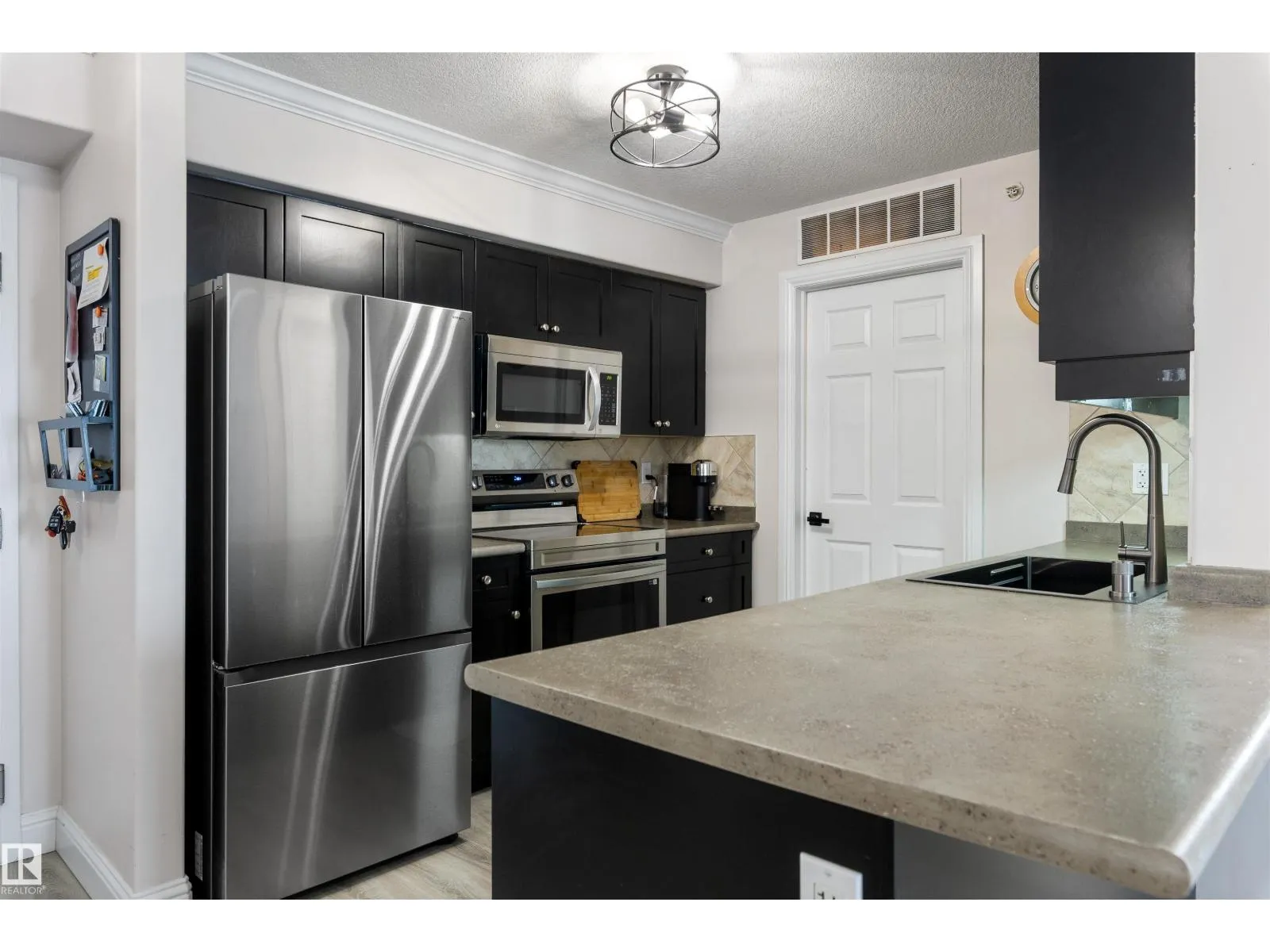 Rare TOP-FLOOR south-facing unit filled with natural sunshine and elegant designer-inspired RENOVATIONS offers an elevated standard of condo living. Flooded with natural light and enhanced by 9’ ceilings, the interior features new laminate flooring, curated paint selections, updated black lighting, stainless steel appliances, sleek countertops, and a deep single-bowl stainless sink, creating a refined and cohesive feel. The OPEN-CONCEPT kitchen,