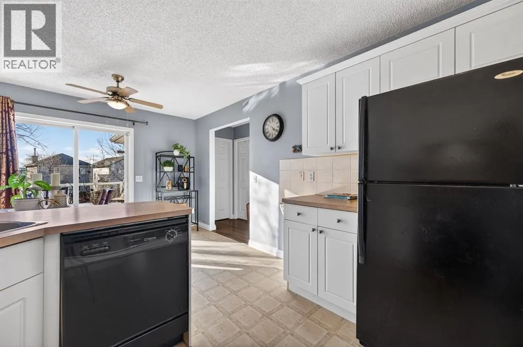 airy feel and an impressive first impression. Large west facing windows flood the main living space with natural light, making the home feel warm and inviting all day long. The living room is anchored by a stunning gas fireplace with a stone surround, the perfect place to unwind after a long day. The main level is as functional as it is stylish and inviting. The well equipped kitchen features ample counter space, black appliances, and a generous dining area designed for hosting friends and family. Whether it’s casual weeknight dinners or weekend gatherings, this space truly brings everyone together. This level also hosts two spacious bedrooms, including the primary bedroom with ample closet space. A full 4-piece bathroom is conveniently located just adjacent to the bedrooms, creating a practical and comfortable layout for everyday living. The lower level truly feels like an extension of the home rather than a basement, thanks to the bi-level design and large windows. Here you’ll find a spacious recreation room with endless possibilities, family movie nights, a playroom, home gym, or games area. This lower area also features two additional bedrooms and a full bathroom, laundry room and additional storage space. The flexible layout in this design is ideal for a home office, guest space, or growing children who need room to spread out. Tile and laminate flooring run throughout, and numerous recent updates make this home move in ready. Step outside to enjoy the beautifully maintained yard, complete with a deck, staircase to the lower yard, and convenient storage tucked beneath the stairs. The large pie shaped lot offers incredible outdoor space, perfect for summer barbecues, kids and pets to play, or simply relaxing in the sunshine. Located just minutes from shopping, parks, schools, and Vivo for Healthier Generations, one of Calgary’s premier recreation facilities. This home also offers excellent access in and around the city and convenient access to transportation. Coventry Hills remains one of Calgary’s most sought after family-friendly communities. Bright, spacious, and perfectly located, this is a home you can truly grow or downsize into. (some photos have been digitally altered for virtual staging) (id:64429)