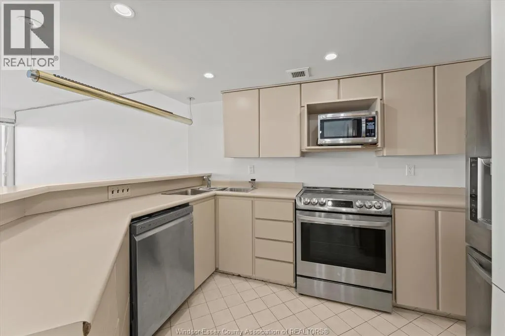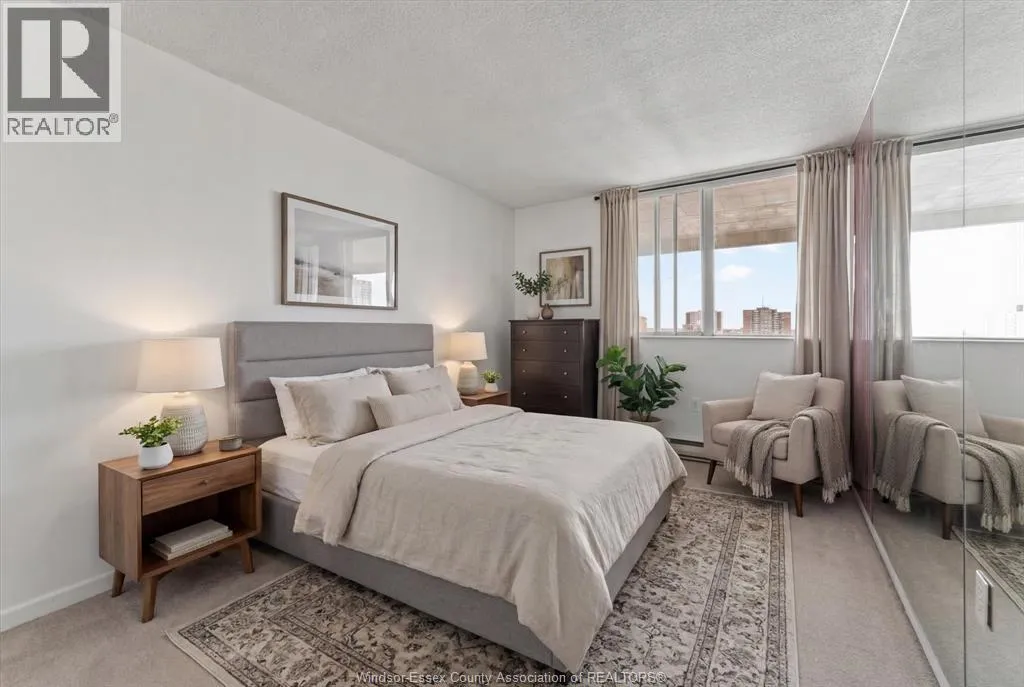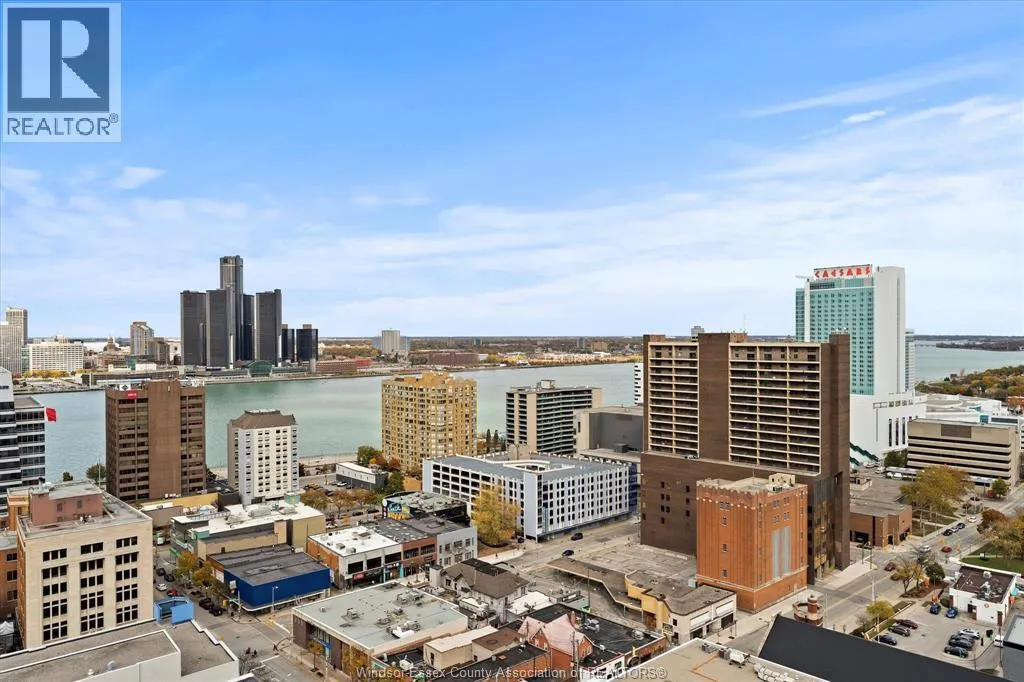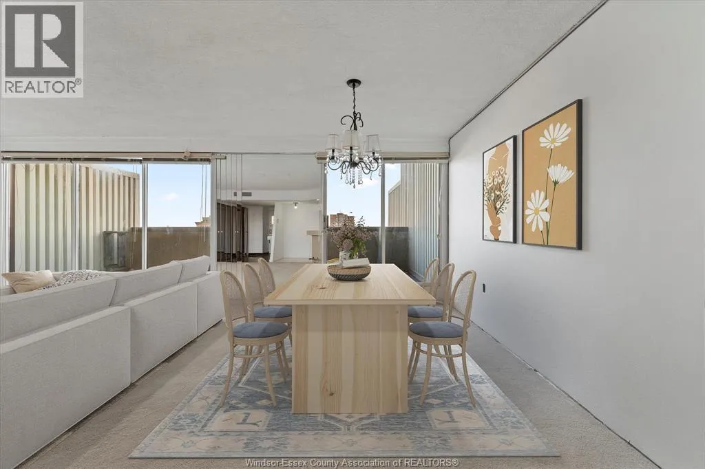 Bright South-Facing Loft Condo with Balcony & Skyline Views – Royal Windsor Terrace. Two-storey loft condominium offering refined downtown Windsor living. Approximately 1,230 sq ft with two bedrooms and two bathrooms. South-facing exposure provides excellent natural light and skyline views. Open-concept main level with modern kitchen and four-person breakfast bar, ideal for entertaining. Private balcony for reading or garden space.