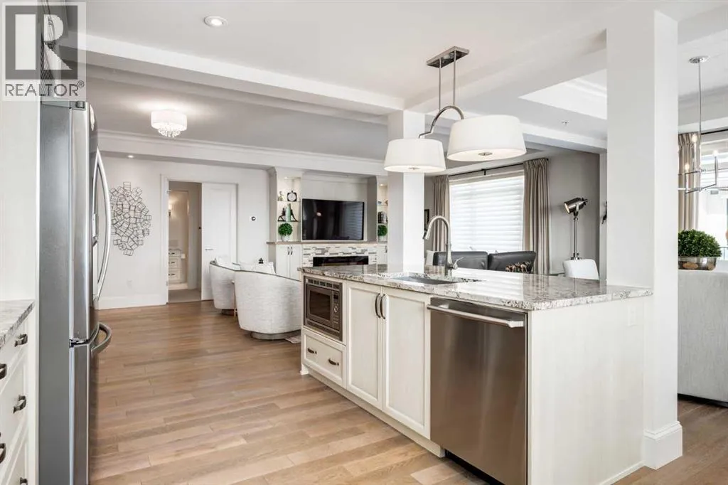 views. Every detail has been thoughtfully considered & the spacious floor plan is sure to delight. A gracious front entrance welcomes you into the suite, & offers a walk-in closet and custom built in cabinetry for your storage needs. The spacious living area with hardwood flooring throughout is sure to delight – a cozy fireplace surrounded by built-ins anchors the living room, sunny & bright dining area with windows on 2 sides is ready to host your family gatherings and provides patio door access to the east facing balcony. The show-stopping kitchen is a chefs dream – expansive island & granite counters, full tile backsplash, luxurious stainless steel appliances including a gas stove & new LG fridge with water/ice dispenser, and an abundance of cabinets providing ample storage including wire pull out racks – so convenient! The serene primary retreat is generously proportioned & offers space for a king-sized bedroom suite & sitting area, while the 5 piece ensuite bath delivers a spa-like experience worthy of a luxury hotel – featuring a relaxing soaking tub, separate shower, granite counters & dual sinks. The walk in closet features a new custom closet system. Second bedroom, equally well-appointed, provides dual aspect windows with beautiful river views & a 3 piece ensuite bath. Additional features include central air conditioning, coffered ceilings, estate millwork, solid core doors, new LG wash/dryer tower with steam function, new composite decking installed on the balcony, new carpet in both bedrooms, Hunter Douglas blinds throughout (black out blinds in the bedrooms), custom drapery in this non-smoking, pet-free home. TWO t itled, side by side underground parking stalls are included, located very close to the elevator, a rare & valuable convenience. Also included is a titled storage locker on the same level as the parking spots. You’ll appreciate the peace of mind that comes with Champagne’s reputation for exceptional maintenance & inherently quiet concrete construction. Additional building features include 2 car wash bays, bicycle storage, plenty of visitor parking & a peaceful courtyard. Plus it’s pet friending – 2 dogs or cats or combo of both, with board approval. The location can’t be beat! Walk to Carburn Park, The Market at Quarry Park offers great amenities including Starbucks, The Park and Original Joe’s restaurants & Co-Op grocery, the Remington YMCA is just around the corner and of course the extensive river pathway system is just outside your door. Easy access to major traffic routes and numerous SE Calgary amenities. This unit shows like new and must be viewed in person to be fully appreciated! (id:64429)