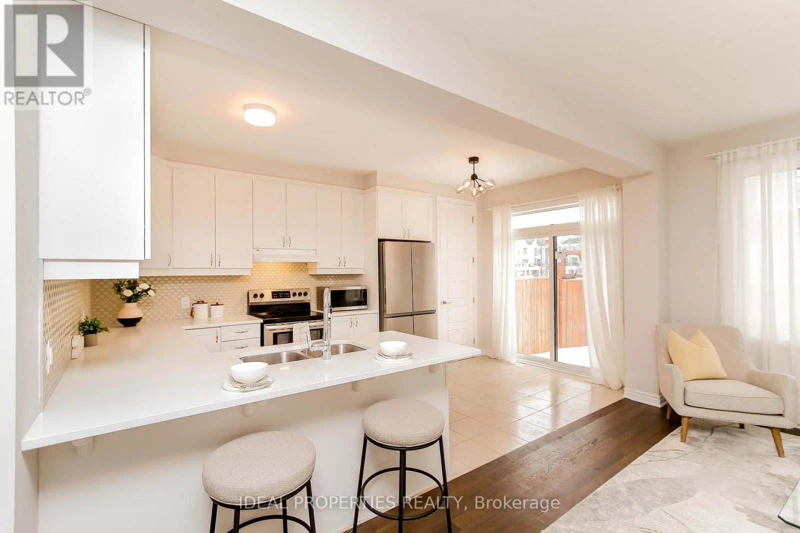 This beautifully upgraded Mattamy Lilac model welcomes you with a charming front porch and a bright, inviting foyer with walk-in closet. The main level features a spacious open-concept living and dining area, perfect for everyday living and entertaining. Enjoy morning coffee at the breakfast bar in the stylish U-shaped kitchen, complete with quartz countertops and enhanced by designer lighting fixtures