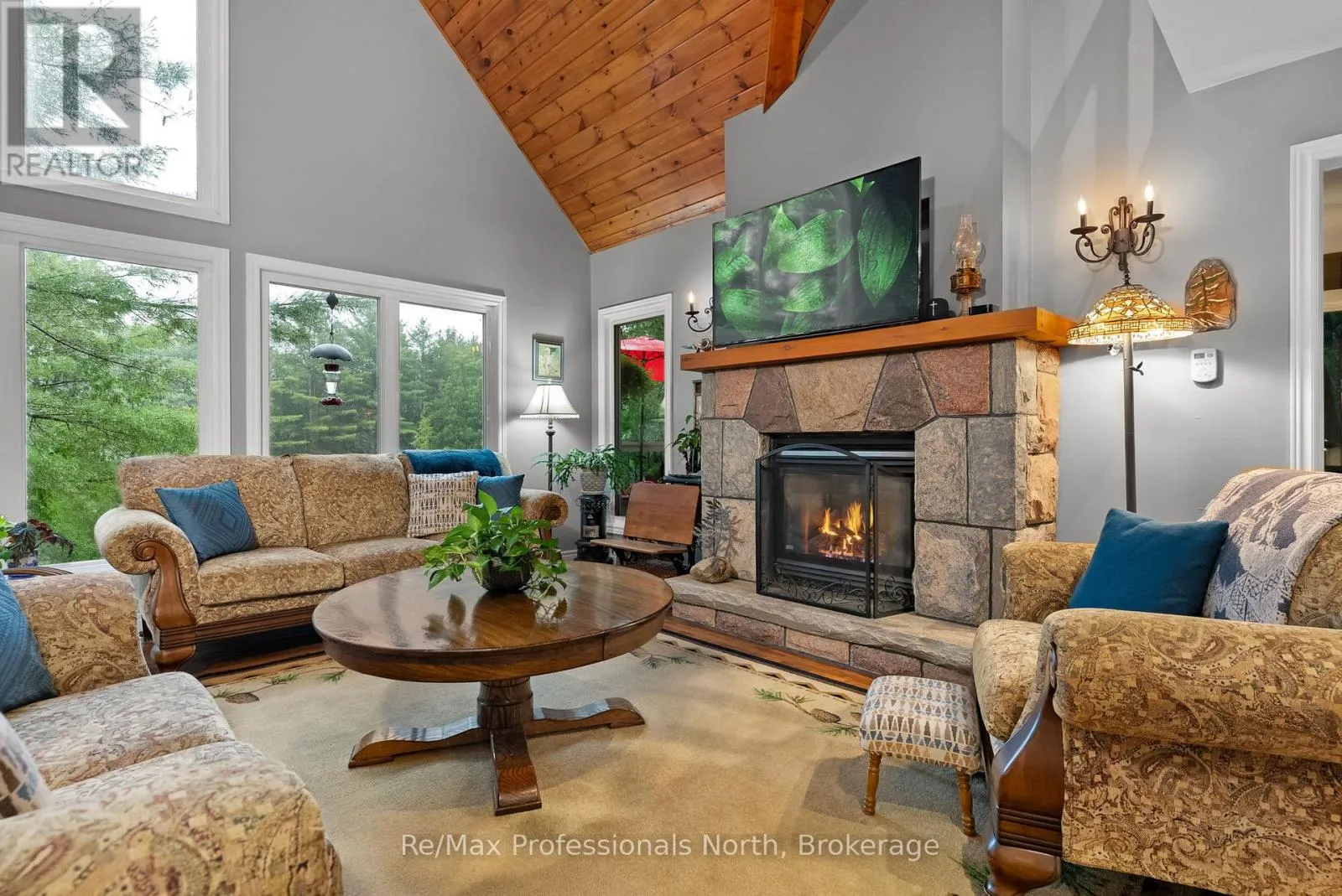 Welcome to “The River View,” a custom-built Muskoka retreat that captures the best of both worlds – waterfront cottage enjoyment paired with the comfort and practicality of a year-round home. Thoughtful design and natural beauty come together in the great room, where soaring windows frame captivating views of the Severn River and a striking granite fireplace creates a warm focal