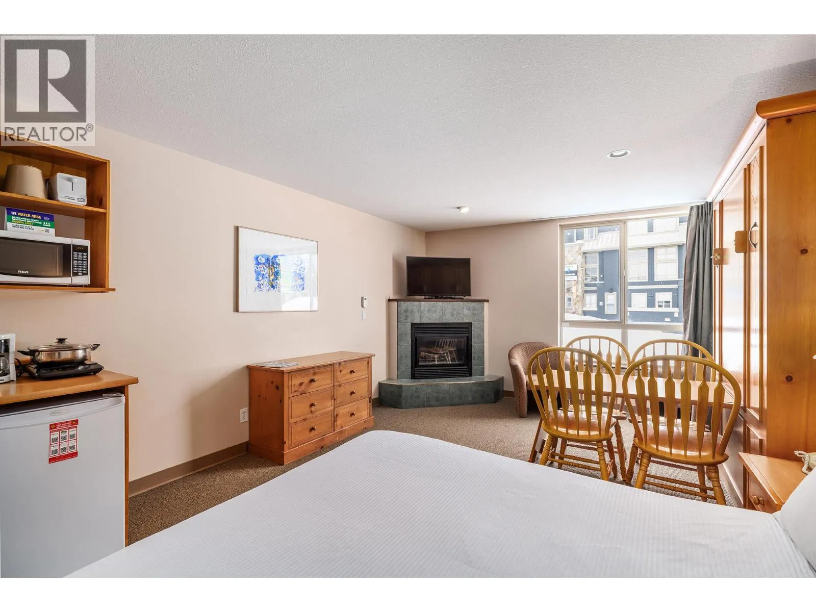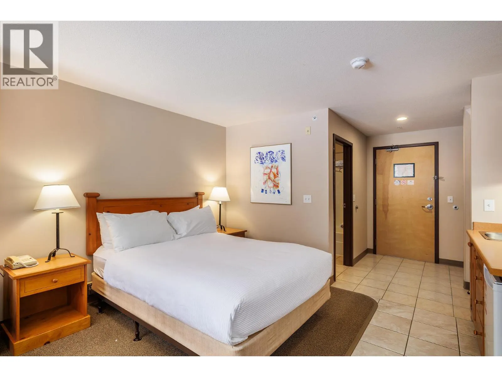 Ski-in/ski-out living in the heart of Big White. This deluxe studio suite offers a comfortable mountain retreat with direct access to the slopes and resort amenities. Designed for efficient living, the open-concept layout features a built-in Murphy bed and thoughtful furnishings that allow the space to comfortably sleep four. The kitchenette is equipped with upper and lower cabinetry, tile flooring,