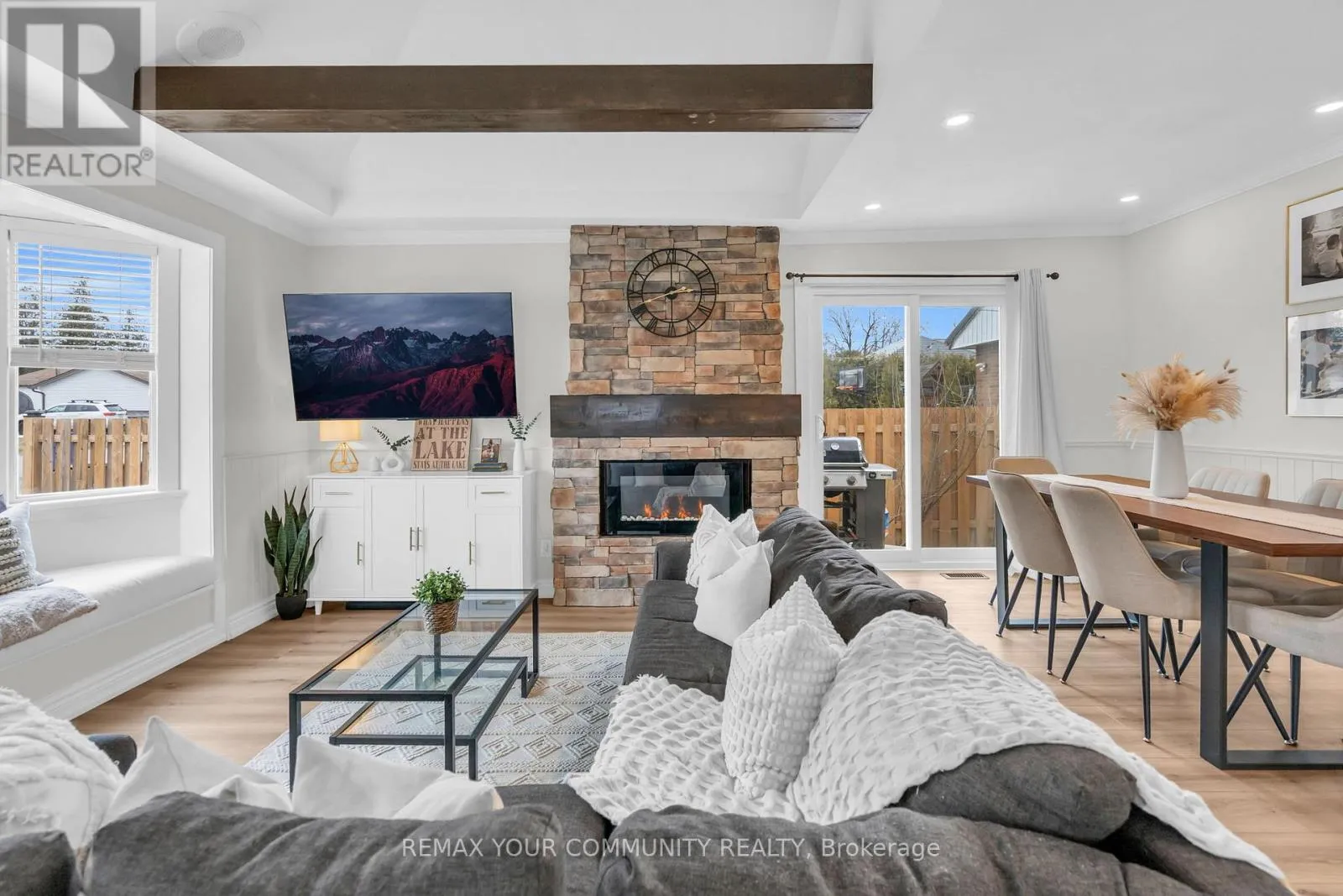 Just steps from Lake Simcoe with exclusive residents only lake access, this well maintained home features a bright updated kitchen with quartz countertops, new flooring throughout the main floor, fresh paint, and plenty of natural light. The sunken living room is full of character with cathedral ceilings, wooden beams, a cozy bow window nook, and a beautiful new fireplace feature.