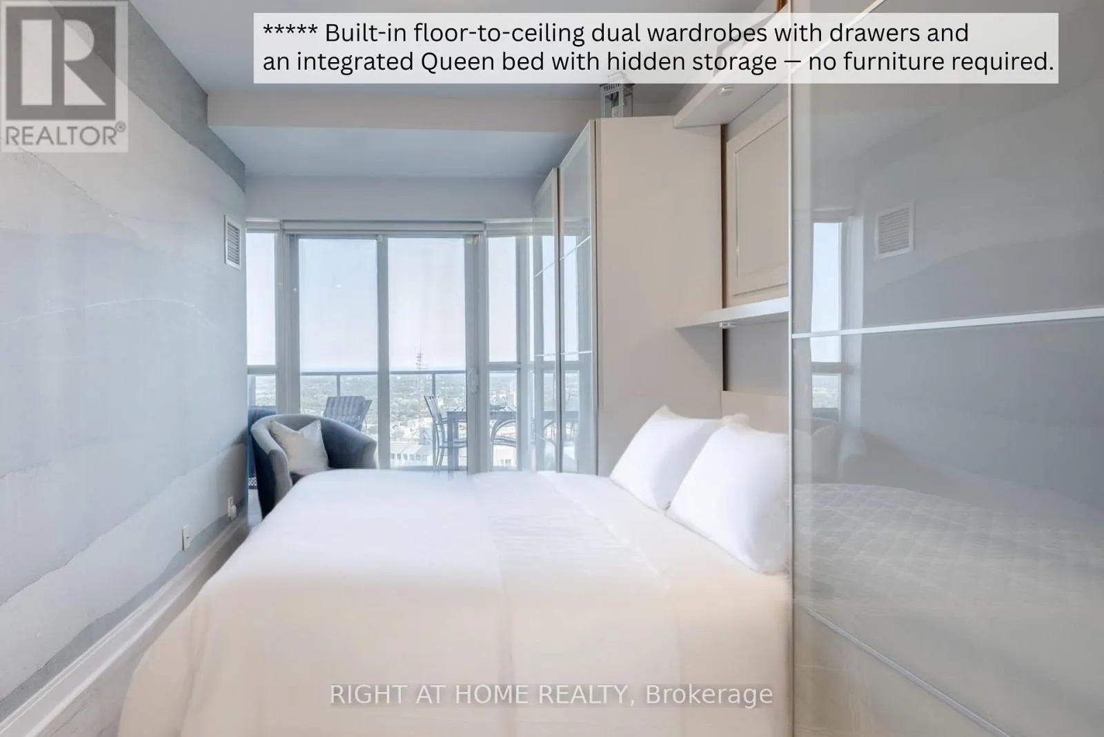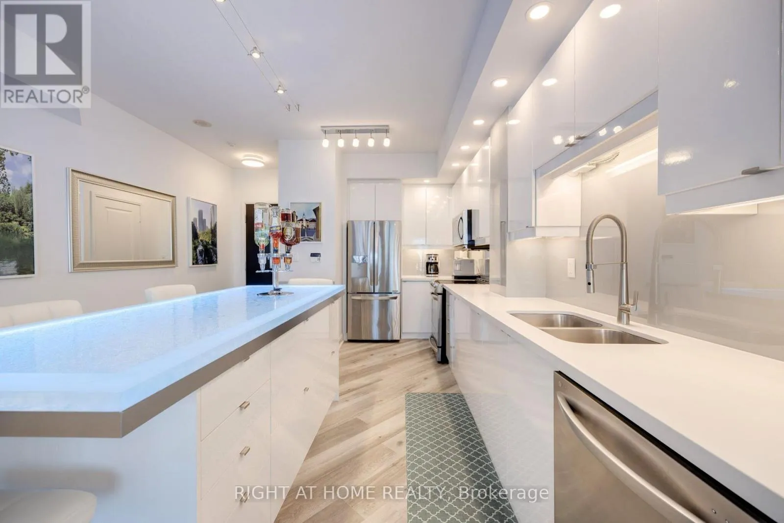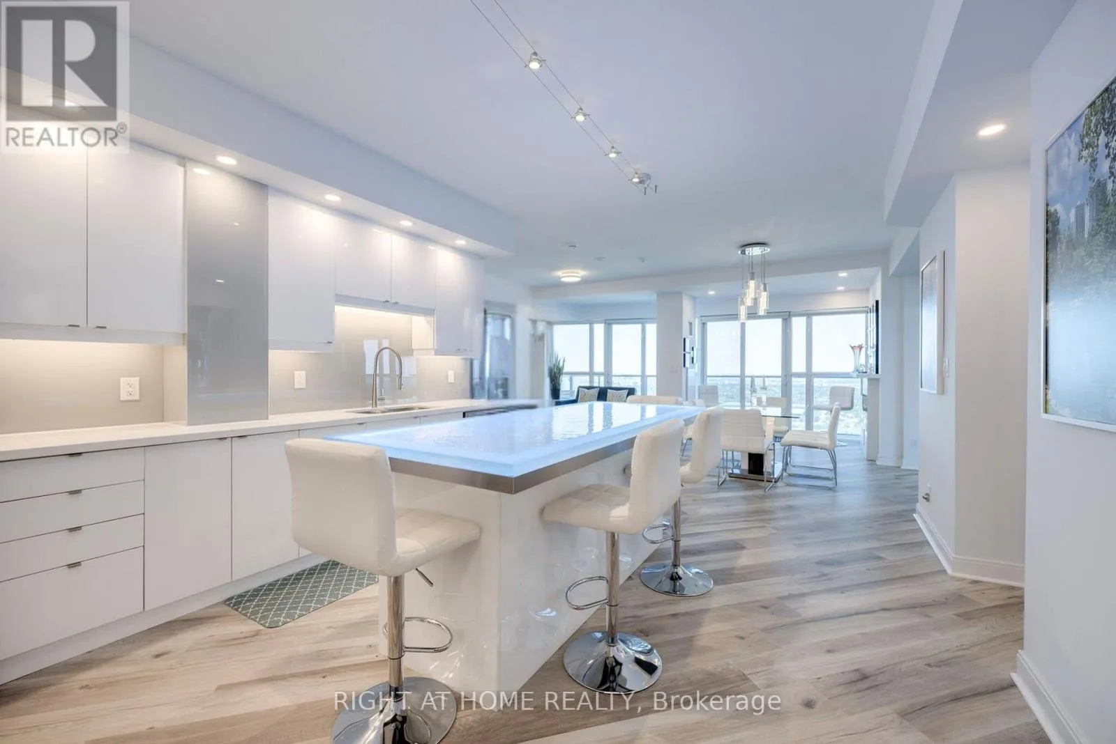 VIEW: This fully renovated 1,105 sq. ft. contemporary residence offers panoramic, unobstructed views of the CN Tower and Lake Ontario, framed by floor-to-ceiling windows and a 225 sq. ft. wrap-around terrace. Southeast exposure delivers stunning sunrises and exceptional natural light throughout the day. KITCHEN: Designed for modern living and entertaining, the custom kitchen features over 30 high-gloss cabinets, a custom