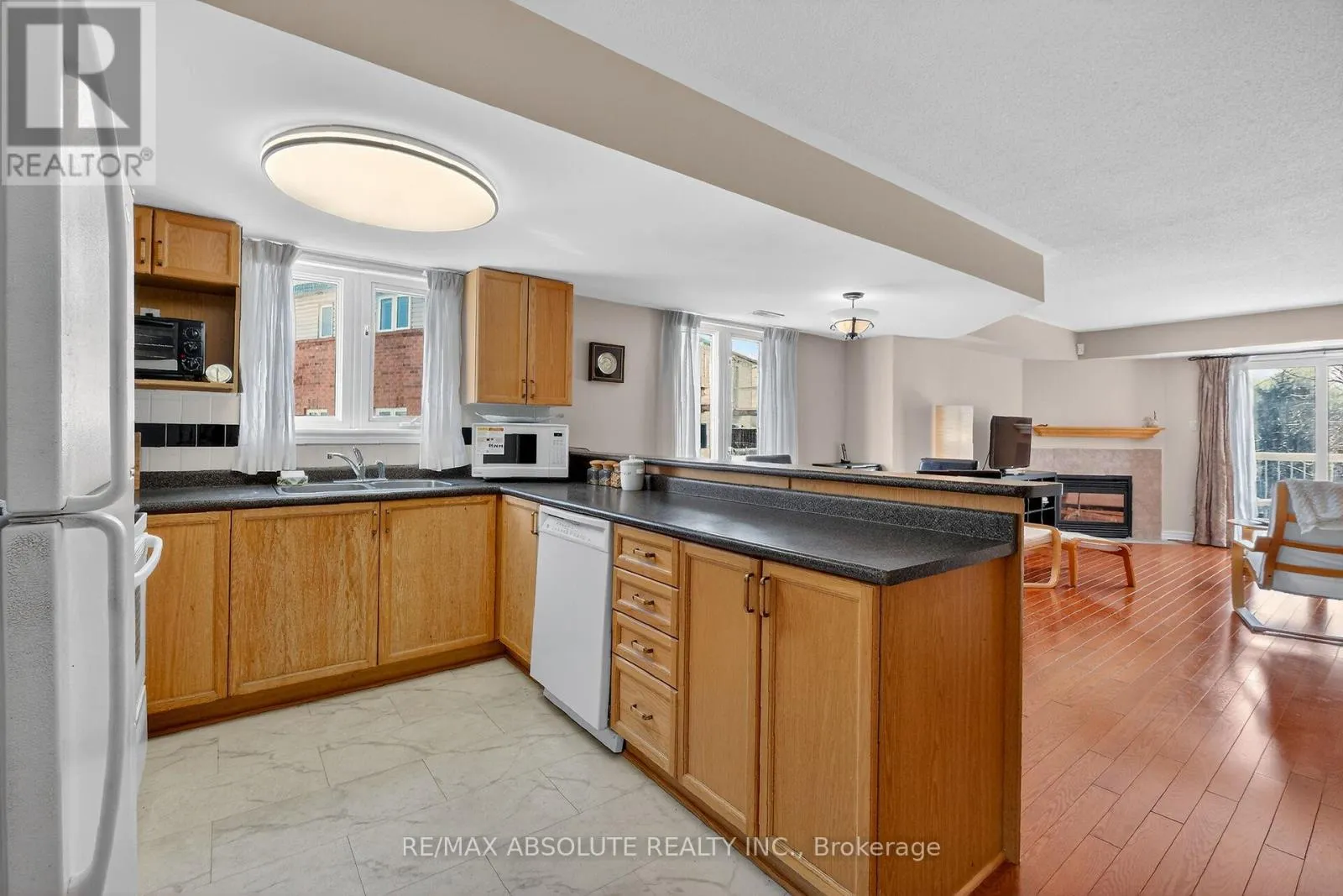 Outstanding 2+1 bedroom end-unit upper condo in a prime location backing onto a scenic wooded area and creek, offering privacy and beautiful natural views. This bright unit features 2.5 bathrooms and an open-concept layout ideal for comfortable living and entertaining. The main level showcases hardwood flooring, a cozy gas fireplace in the living room, dining area and patio door access