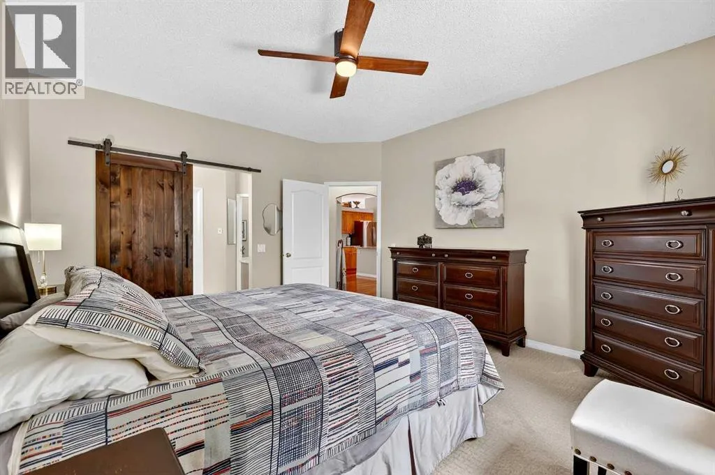 pie lot just steps from Cranston Ridge, mountain views and the Bow River pathways. Designed throughout for comfort and functionality, you’ll first step up to a generous formal dining area or versatile front room. The main living space features rich Brazilian cherry hardwood flooring and an open-concept layout that flows into a finely appointed kitchen. This chef-inspired space is anchored by updated granite countertops and a massive island, complemented by premium Bosch appliances and a spacious corner pantry. The adjacent eating area and living room includes a cozy gas fireplace, walking directly out to an elevated deck – two steps down to a meticulously manicured and landscaped back yard. The primary bedroom suite offers ample space for a king-sized bed, with a large walk-in closet, and a spacious recently-renovated 5-piece ensuite complete with a dual vanity and jetted tub A second bedroom on the main floor provides the perfect layout for a dedicated home office or den. Practicality is found in the tiled main landing, which includes a 2-piece powder room and a large laundry room, entering from the attached double garage featuring a new garage door.The fully developed lower level adds another 1266 sqft of developed living space, starting with a massive recreation room, highlighted by new marble floor to ceiling fireplace and a convenient wet bar for entertaining or peaceful relaxation. This level includes a sunny large third bedroom that shares a convenient 4-piece Jack and Jill bathroom, with a functional 4th bedroom space. The bathroom featur es a custom Finnish cedar wet sauna, providing a full spa experience.Outdoor living is the true highlight, featuring a large private yard anchored by a spacious deck that steps down to a custom stone patio, all surrounded by beautiful perimeter gardens, including apple and other fruit trees and flowering bushes. The expansive pie lot also allows room for a future RV pad alongside the house and includes a spacious shed. Located close to the City pathway system, schools, and Cranston’s community amenities, your next home offers a priceless combination of light, space and quality finish in one of Cranston’s most desirable locations. (id:62650)