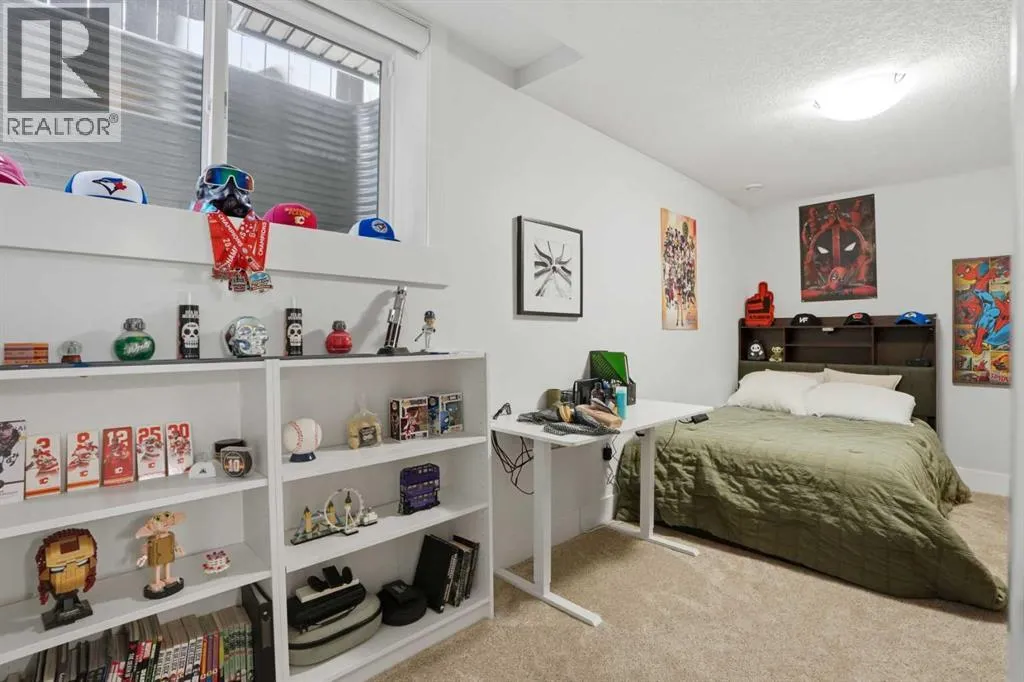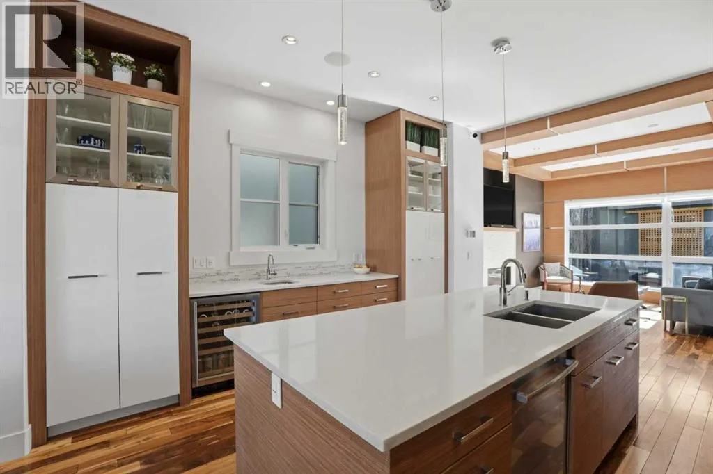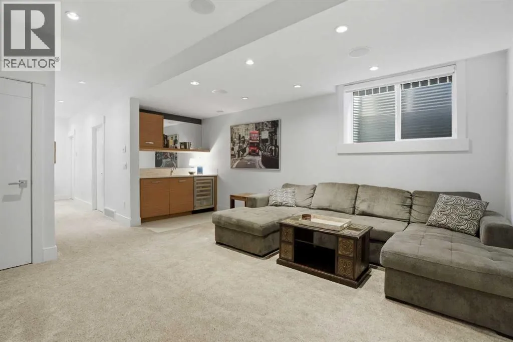 Inside, the home unfolds into a beautifully curated main level that balances sophistication with livability. From the moment you walk in you can feel how well this home has been cared for. The open-concept design creates a seamless flow, anchored by a stunning living space featuring a contemporary tiled fireplace that adds both warmth and architectural interest. Thoughtful additions like a functional mudroom and main floor powder room ensure the home is as practical as it is polished, while rich hardwood flooring ties everything together with timeless elegance.The kitchen is nothing short of impressive—designed to elevate both everyday moments and making entertaining effortless. Custom-built cabinetry, sleek quartz surfaces, and an expansive island create a striking focal point. Premium stainless steel appliances—including a gas cooktop, a built-in microwave (2023), a silent dishwasher with a third rack (2023), and a beverage fridge—offer both performance and style.Upstairs, the home continues to impress with high ceilings, three grandly scaled bedrooms, a full bathroom, and a dedicated built-in workspace—perfect for modern family life or working from home. The primary suite feels like a private escape, complete with a spa-inspired 5-piece ensuite and a spacious walk-in closet. Plush new carpeting (2023) enhances comfort throughout the entire upper level.The fully finished lower level expands your living space intentionally, offering a large recreation area ideal for entertaining or relaxing, a sleek wet bar with a beverage fridge, a fourth bedroom, and a beautifully appointed full bathroom. With new carpet installed in 2023, this level feels fresh, inviting, and ready to enjoy.This home has been meticulously cared for and thoughtfully upgraded over time. Upgrades include a newer roof (2017), furnace and water softener (2020), full interior repaint (2023) with touchups done (2026), and a brand-new 75 gallon hot water tank (2024), ensuring stress-free years ahead.Outdoors, the south-facing backyard is designed for both relaxation and connection. Featuring a raised seating area, and an electric retractable awning for added comfort, the space transitions effortlessly from daytime lounging to evening entertaining. Ambient string lighting completes the setting, creating a warm and inviting atmosphere long after the sun goes down. Whether for a morning coffee or evenings with friends this spacious backyard offers just what you are looking for! This is more than just a home—it’s a complete lifestyle opportunity in one of Calgary’s most desirable neighborhood! (id:62650)