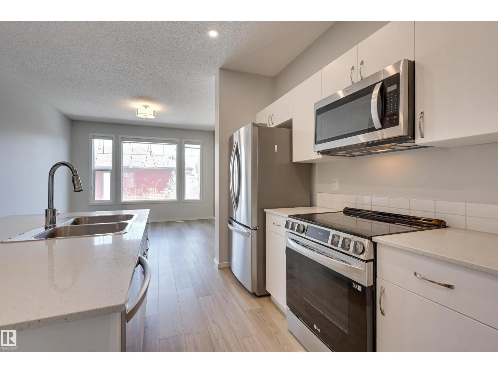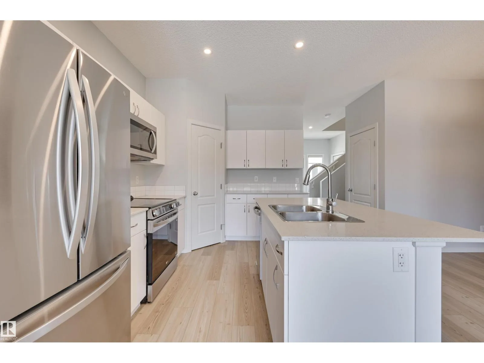 This well-designed end unit townhouse offers exceptional value with a functional and modern layout. The bright main floor features a welcoming foyer with a den/office, a spacious living room filled with natural light, and a stylish kitchen complete with a large island with seating, quartz countertops, stainless steel appliances, tile backsplash, and pantry, all open to the dining area. A