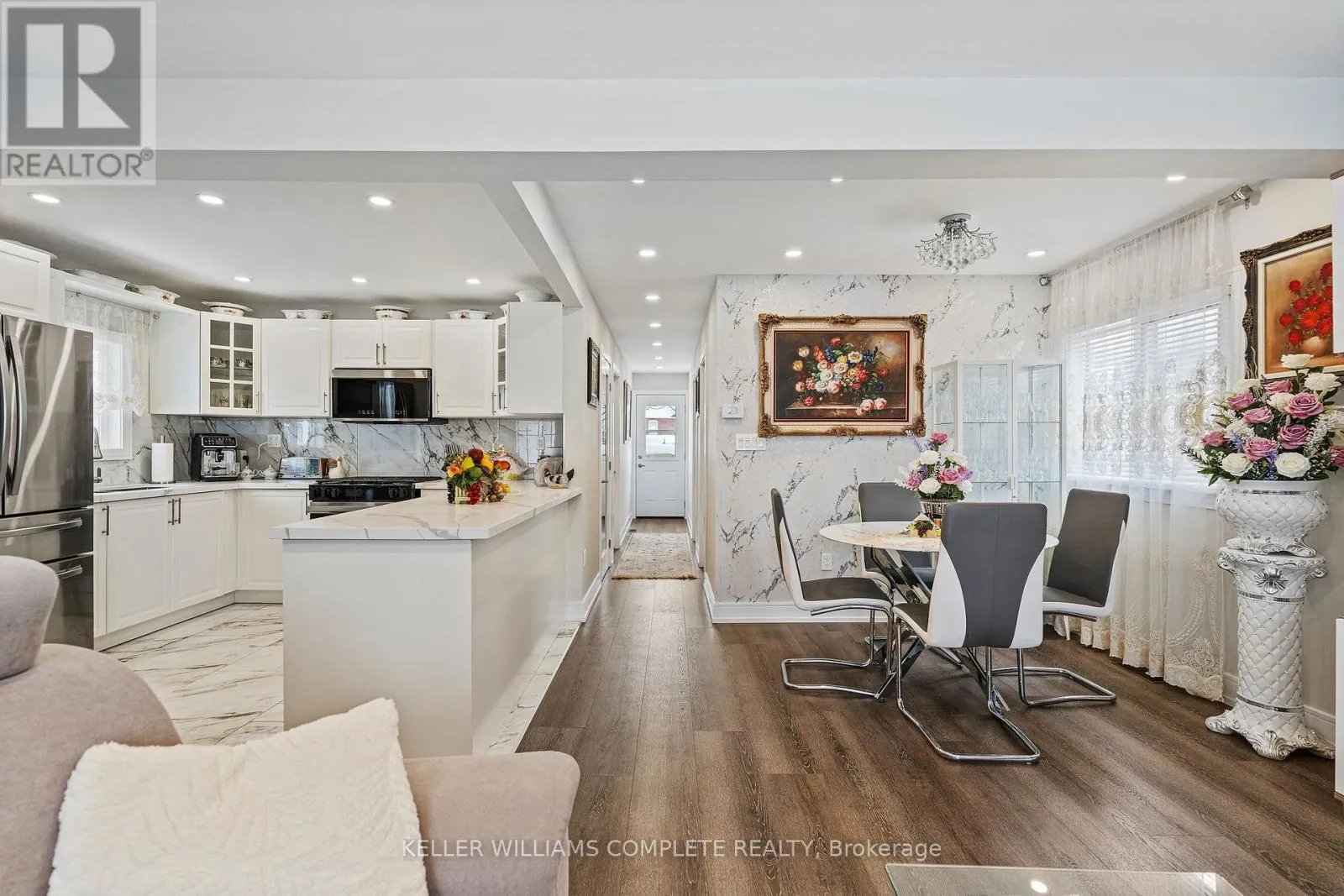 Step inside this fully renovated Niagara Falls bungalow and experience a perfect blend of modern style and comfort. The open-concept main level boasts bright living and dining space highlighted by a showpiece high-gloss media wall and smart LED lighting. Entertain with ease in the designer kitchen featuring polished marble-look tile flooring, quartz countertops, sleek cabinetry, and stainless steel appliances. The
