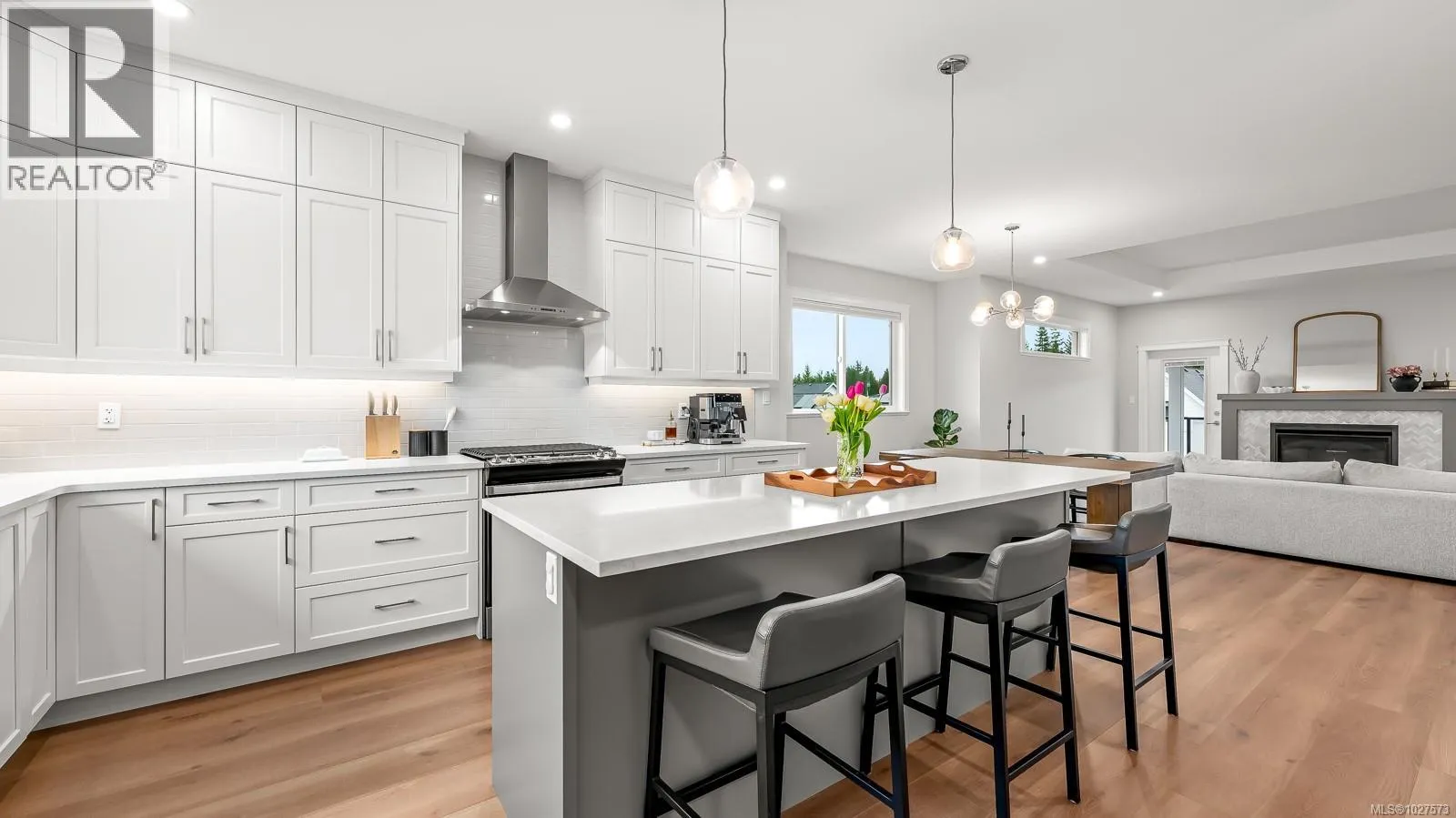 Immaculate, like-new 4 bed, 3 bath home located in The Ridge. Offering over 2,600 sqft of thoughtfully designed living, this home, with nearly 10′ ceilings, features a bright open-concept living room with a statement gas fireplace and a beautifully appointed kitchen with quartz counters, an oversized island, stainless steel appliances, and walk-in pantry. The primary suite is a true retreat