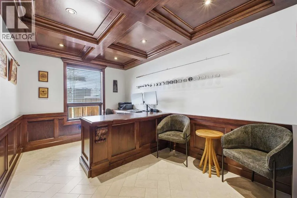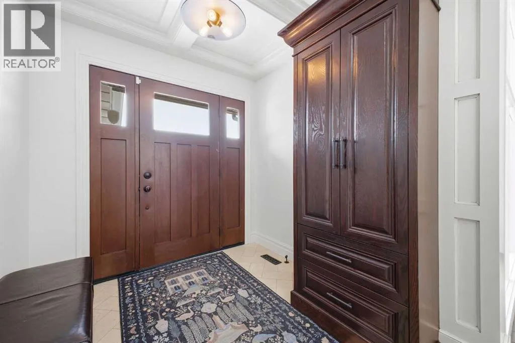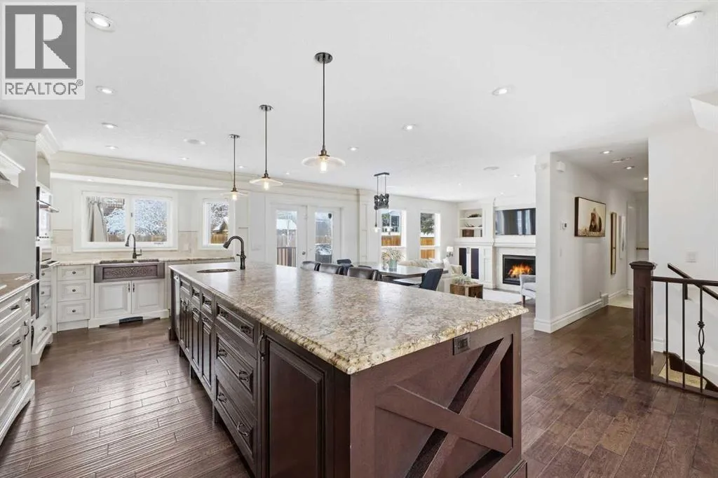 room highlighted by an oversized chandelier and dual ceiling fans. The showpiece kitchen is finished with custom millwork and cabinetry, granite countertops, a 12’ island with seating where friends and family can gather, two copper sinks, and top tier appliances including a Bertazzoni Italian gas cooktop. A spacious dining area easily accommodates family dinners or large gatherings. The sunken family room is anchored by a striking feature fireplace and custom built ins, while a private office with a coffered ceiling and herringbone tile flooring creates an ideal work from home retreat. A stylish 2 piece powder room and a generous laundry/mudroom—complete with herringbone tile, coat hooks, and individual storage cubbies—round out the main level. Upstairs, a quiet loft with an overhead skylight leads to three generously sized bedrooms and a beautifully updated 5 piece main bath. The primary suite is a true sanctuary, featuring his and hers custom closets with individually designed millwork, built in entertainment and art frames, and an elegant chandelier. The secluded 5 piece ensuite includes a large dual sink vanity, a new bathtub, and a separate shower finished with natural Italian stone and a granite bench. The additional bedrooms each offer built in closets. The fully developed basement is designed for both entertainment and wellness. A spacious media/family room features a hard wired solid wood entertainment unit, plus an entertainment nook with a wet bar, commercial grade fridge, dishwasher, storage, and wine rack. A dedicated home gym with commercial grade rubber flooring, floor to ceiling m irrors, and built in shelving provides a private space to work out. Two additional bedrooms, a 3 piece bath, and a large storage area complete the lower level. Additional highlights include central air conditioning, built in speakers throughout, a new Lennox high efficiency furnace, new AO Smith hot water tank, Kinetico water softener, Vivint/Telus alarm system, and complete removal of Poly B plumbing. Outside, enjoy the exposed aggregate front porch and a beautifully finished backyard with a deck coated with Duradeck, raised garden boxes within a gated garden area, a garden shed, and a Rain Bird irrigation system. Parking is effortless with the oversized triple attached garage, featuring epoxy flooring, a finished ceiling, EV charger, built in heater, and custom floor to ceiling cabinetry with quartz countertops. This premier location offers nature at your doorstep along with convenient access to schools, shopping and public transit. (id:62650)
