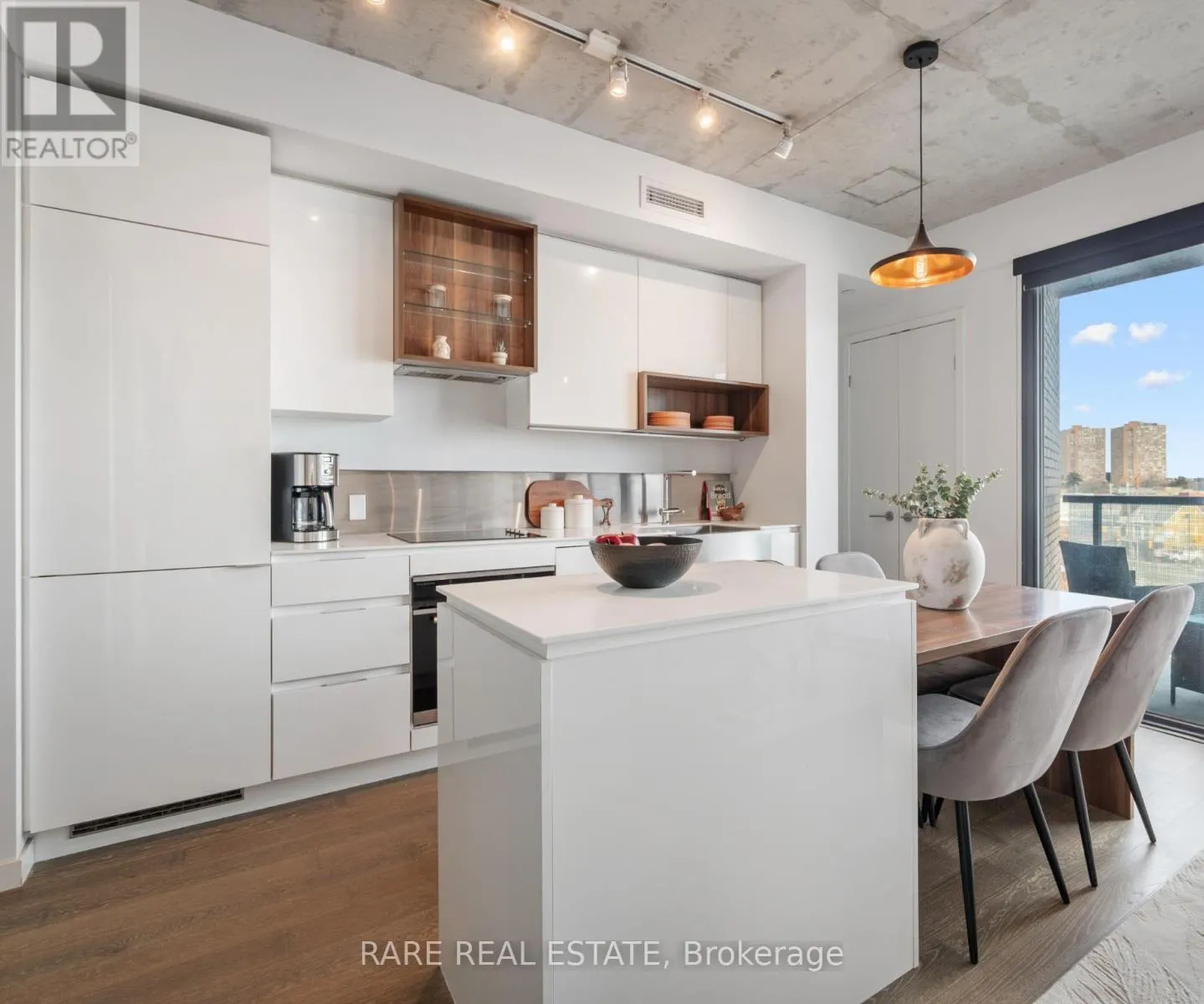 Offers anytime! Welcome to Suite 608 at 383 Sorauren Avenue, a stylish one-bedroom plus den boutique condo in the heart of Roncesvalles. Tucked away on a quiet, tree-lined street, this light-filled suite blends modern loft-inspired design with the charm of one of Toronto’s most vibrant neighbourhoods. Inside, you’ll find soaring 9-foot exposed concrete ceilings, hardwood floors, and large windows showcasing