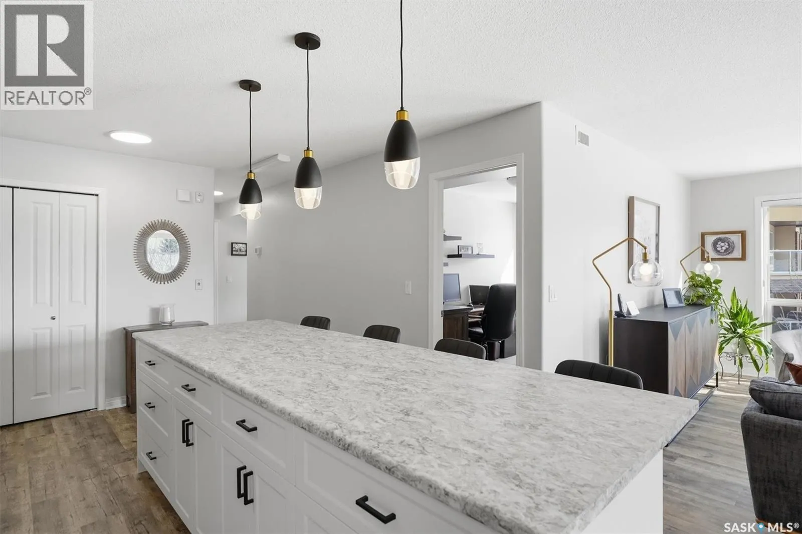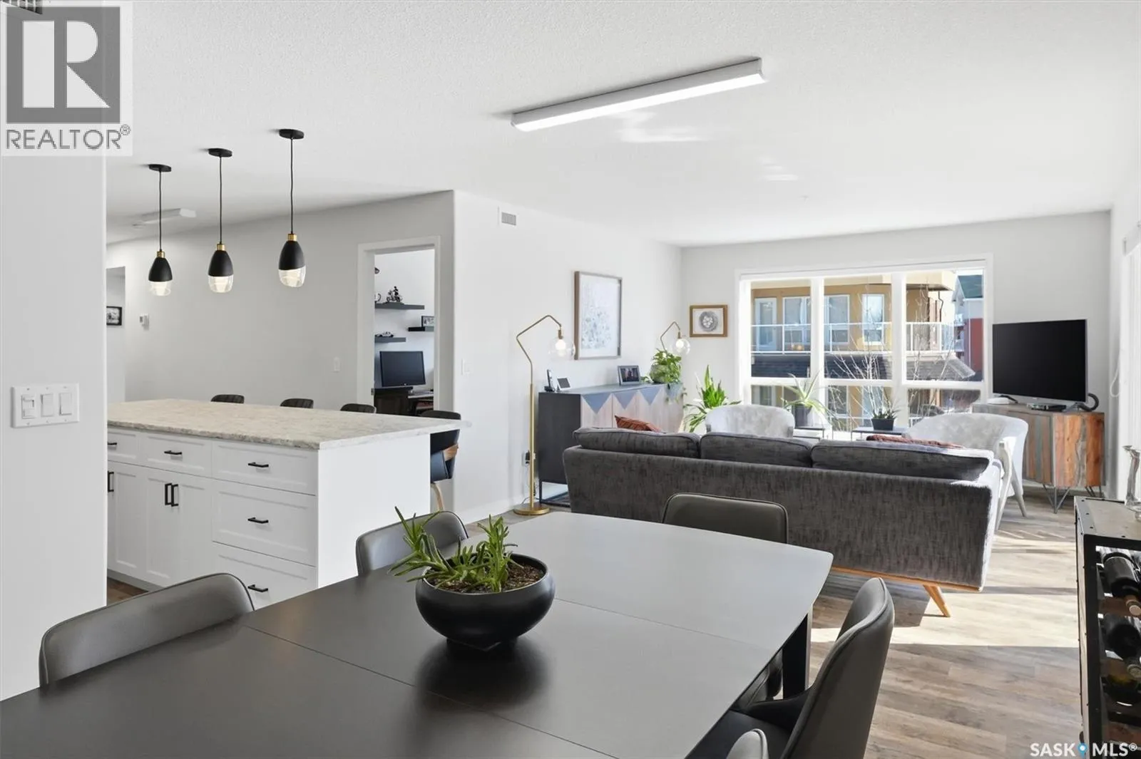Discover spacious, modern condo living in a sought-after, mature neighborhood! 203-914 Heritage View: 1,346 sq ft corner unit with 2 bedrooms, den and 2 bathrooms. Southeast facing for an abundance of natural light. Gourmet kitchen (new cabinets installed in 2025), stainless steel fridge, stove and microwave. 9′ oversized island with extended counters, pot drawers, seating and pendant lights. Spacious dining