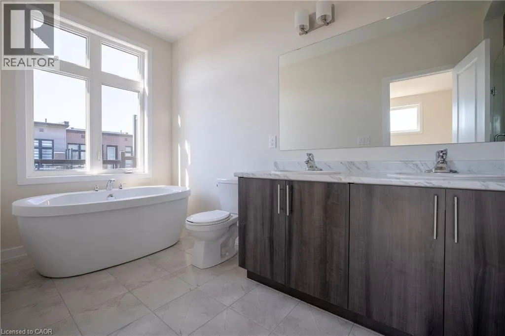 throughout the home. The second floor is light filled with an open concept kitchen, dining, and living area under 10 ft ceilings. The kitchen features stainless steel appliances, a centre island, and generous storage. The dining room has a walkout to the balcony for easy indoor to outdoor entertaining, and a powder room completes the level. The primary bedroom includes a private balcony and a 5 piece ensuite with a freestanding deep soaker tub, seamless glass shower, and a double vanity with undermount sinks. Three additional bedrooms and two 4 piece baths provide flexible space for family, guests, or a home office. Minutes to 403, QEW, and 407, and close to parks, trails, shops, and well regarded schools. (id:62650)