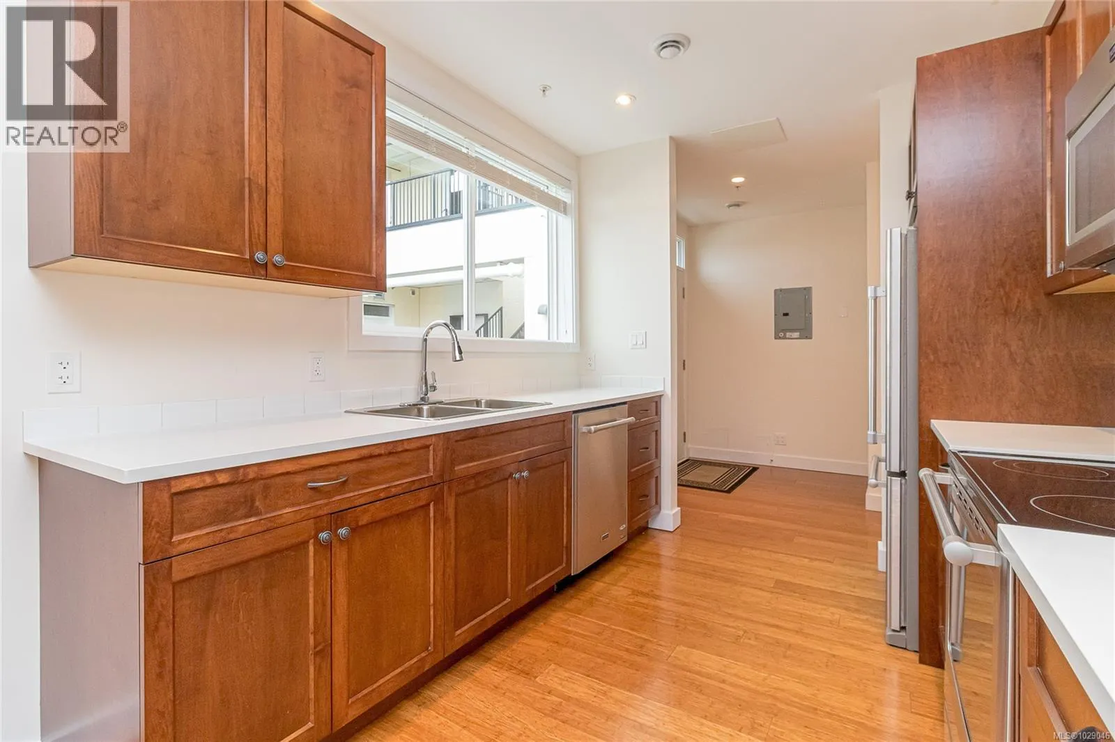 This thoughtfully designed, eco-conscious complex offers the features needed for comfortable and efficient living. This 1 bed + den, 2 bath unit offers over 1000 sq ft and overlooks the open courtyard below, with a private limited common property rooftop patio area for your outdoor enjoyment. The home features open-concept living, and the kitchen appliances are barely used—essentially brand new.