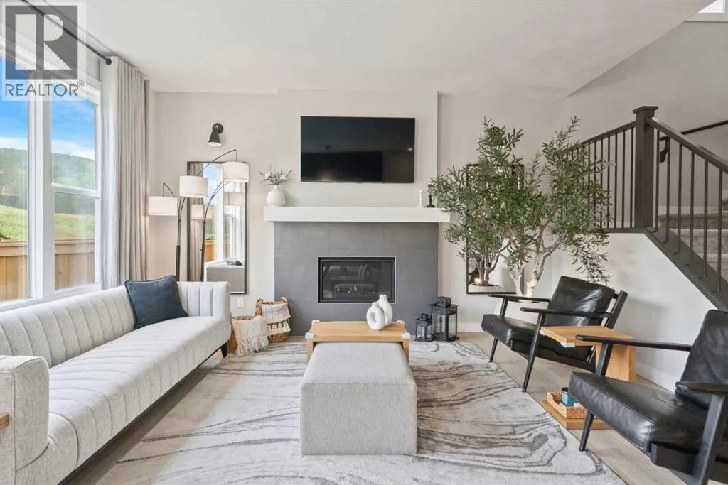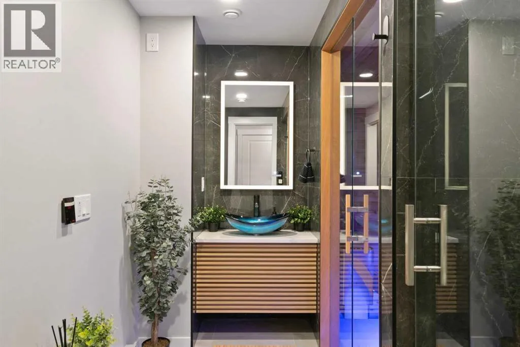 where luxury and nature meet. From the moment you enter, a wall of windows along the rear of the home frames uninterrupted greenspace views, filling the interior with natural light. The main floor boasts 9’ ceilings, luxury vinyl plank flooring, and a seamless open-concept design. The chef’s kitchen is a masterpiece featuring ceiling-height cabinetry, quartz countertops, a herringbone backsplash, premium stainless steel appliances including a wall-mounted oven and gas cooktop, a massive island with breakfast bar, and a walk-through pantry. The dining and living areas blend beautifully, complemented by a tile-surround gas fireplace, while a front flex room provides the perfect home office. Upstairs, the wrought-iron staircase leads to a bonus room overlooking the backyard views, along with 4 spacious bedrooms. The primary retreat is a true sanctuary with a spa-like ensuite offering dual sinks, quartz counters, a glass shower, and a freestanding soaker tub. The upper level is completed by a designer laundry room with built-ins, front-load appliances, and decorative tile flooring. The professionally developed basement with 9’ ceilings is designed for an elevated lifestyle. A private theatre room with custom built-ins and bar fridges creates the ultimate entertainment zone, while the glass-enclosed home gym with professional flooring offers a space to recharge. Off the gym, you’ll find a private wellness retreat featuring a full sauna and steam shower, creating the ultimate at-home escape! Modern comforts extend throughout the property, including full central air conditioning, a smart lighting package in the basement, and an impressive Gemstone exterior lighting system that elevates the home’s curb appeal year-round. Outdoors, the escarpment is your personal backdrop. Enjoy coffee in your huge yard, evenings watching wildlife, or children playing in the quiet yard. Just steps to the Bow River pathways and minutes to schools, shops, restaurants, South Health Campus, and major routes. Book your showing today, you are going to love this home! (id:64429)