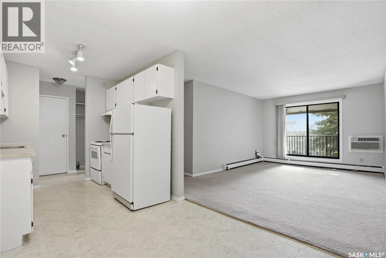 This is a bright & well-kept 2-bedroom, 1 bath, a large storage room, a white galley kitchen with a dinette area. The Open living room is filled with sunshine, patio doors to a south-facing balcony with a beautiful spruce tree for privacy. Wall-mounted AC to keep your area cool. Located in East College, a desirable area close to shopping &