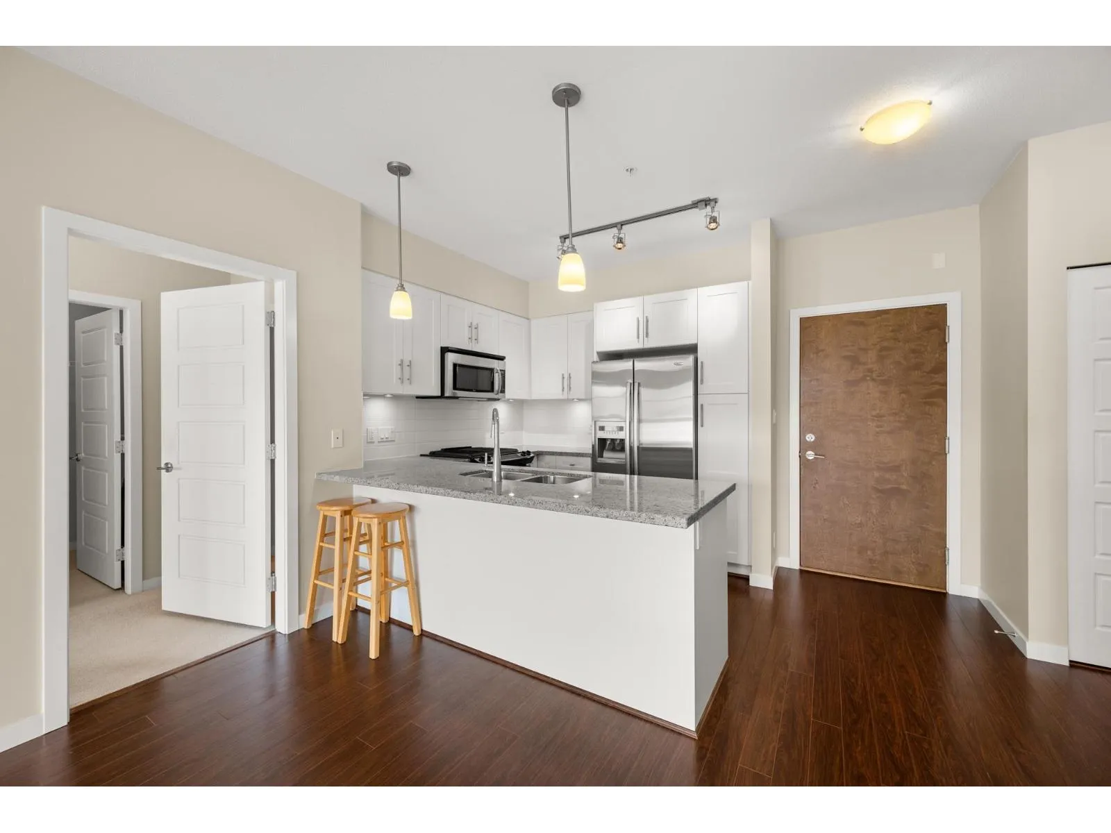 Award winning Bedford Landing. Only 2 bdrm unit available in the 55+ building offering a rare, west exposure! Original owner and in new near condition. Stainless steel appliance package. Kitchen area overlooks living and dining areas, with ample cupboard space and granite counters with an eating bar. Secured underground parking with two spaces and a convenient storage locker across the