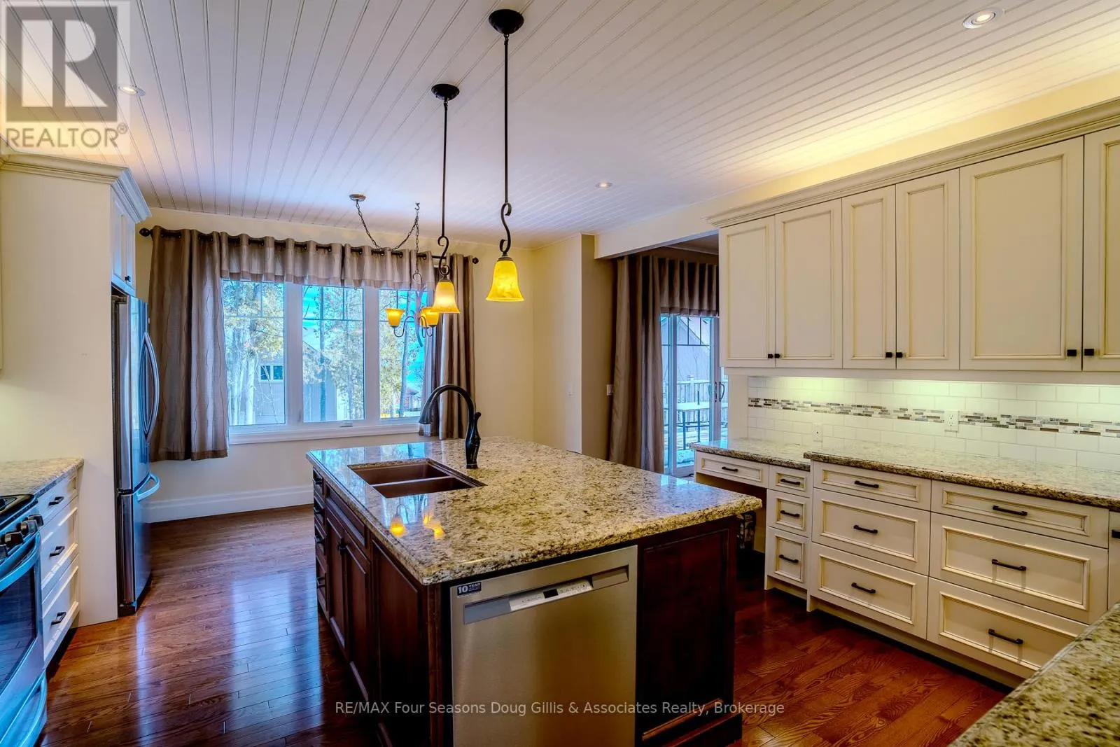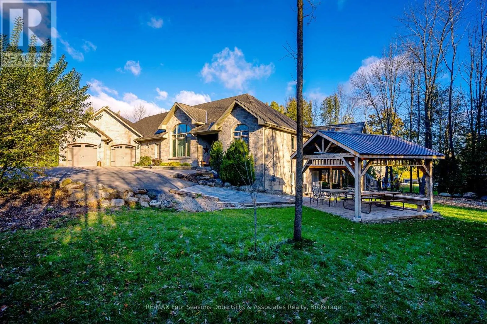 Welcome to this exceptional 4,588 sq ft custom-built home, ideally situated on a private 0.89-acre (+/-) cul-de-sac in one of Meaford’s most desirable neighbourhoods. Offering 5 bedrooms and 3.5 bathrooms, this beautifully designed residence blends timeless curb appeal with comfort and functionality. The exterior impresses with professional landscaping, split rail fencing, dual stone-pillared driveways, and a striking stone and brick